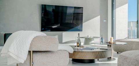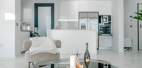 La amplia sala de estar está bañada por la luz natural, con una cocina de concepto abierto equipada con electrodomésticos inteligentes Samsung de alta gama y acabados exclusivos de Porcelanosa. Con su diseño impecable y materiales de primera calidad, este espacio es perfecto tanto para la vida cotidiana como para el entretenimiento.