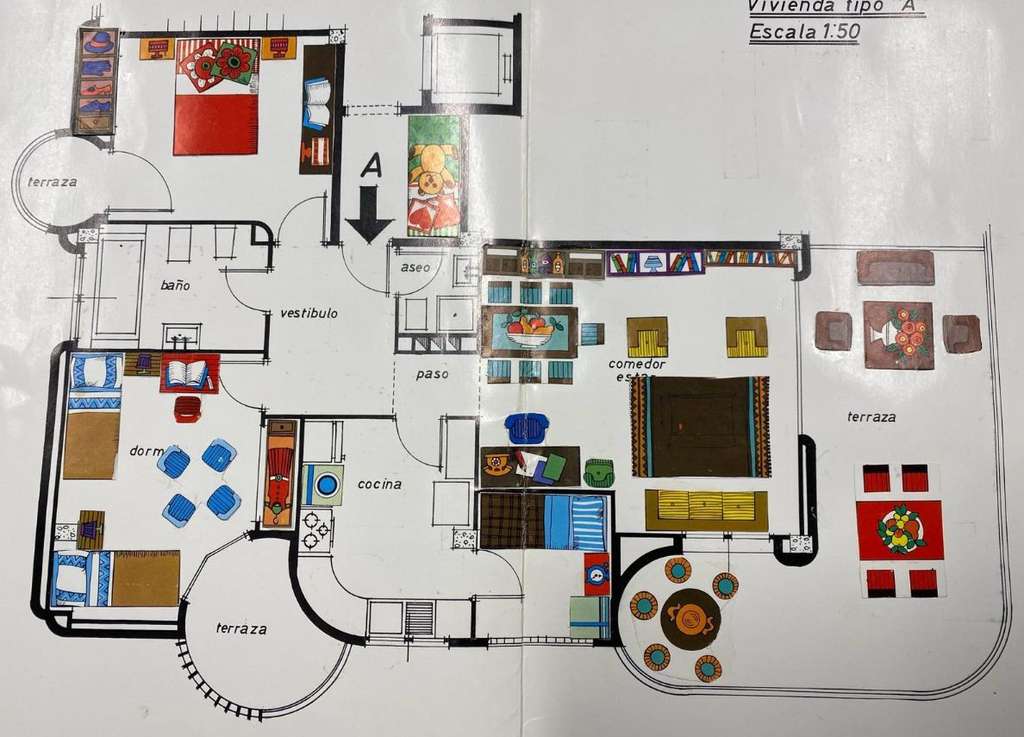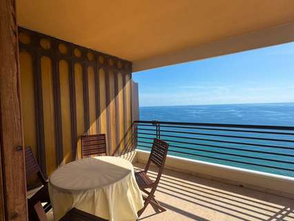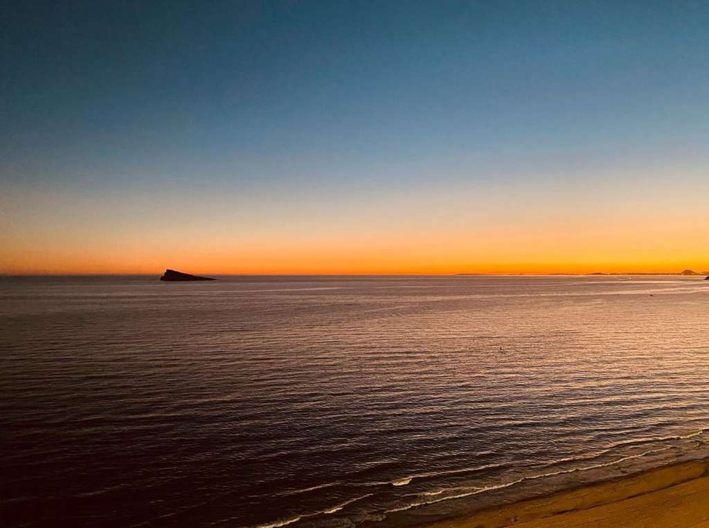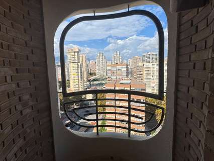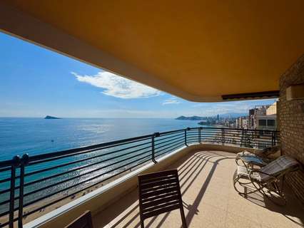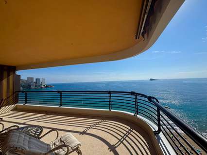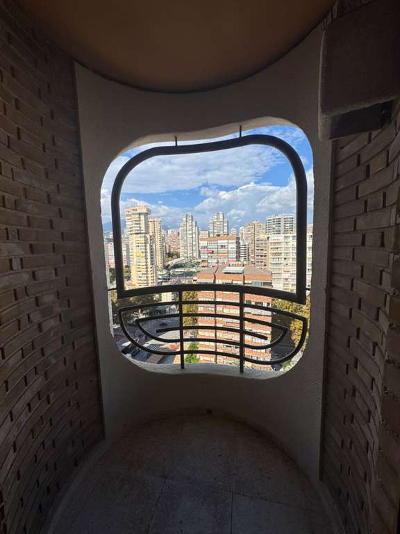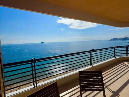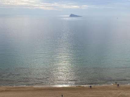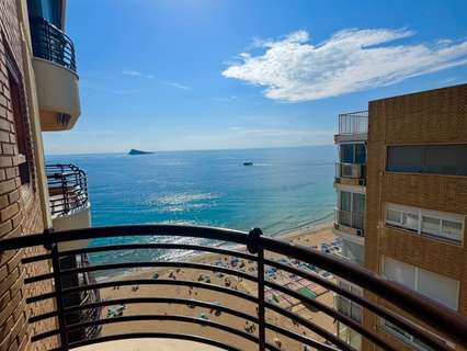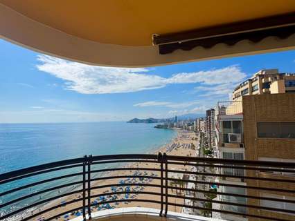 Primera línea de playa Levante en Benidorm. Apartamento de 3 dormitorios, cuarto de baño y aseo.Dormitorios 1 y 2 con terraza. Gran terraza en forma de L en las fachadas sur y oeste, con posibilidad de cuarto dormitorio.Urbanización con piscina comunitaria y parque infantil con tobogán y columpios.