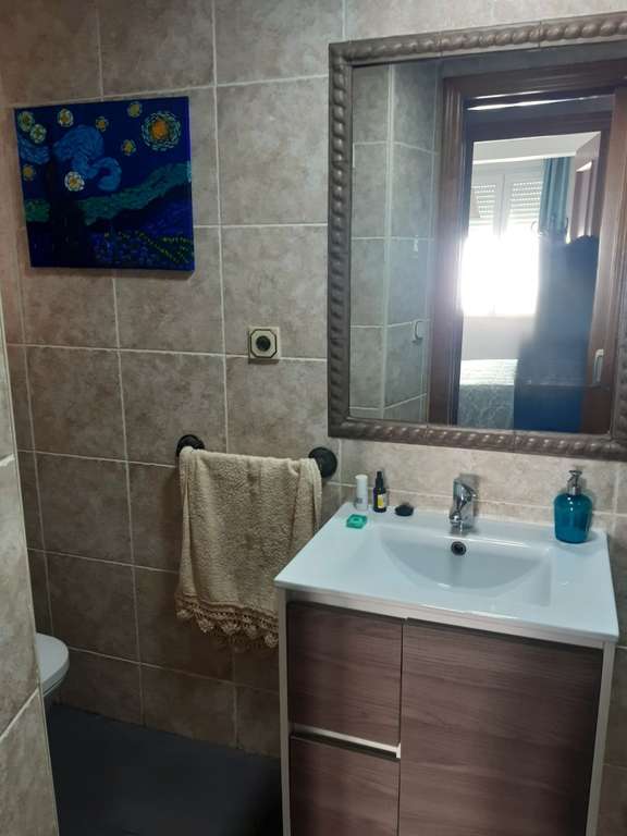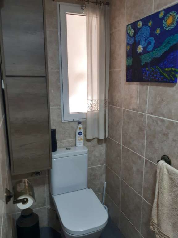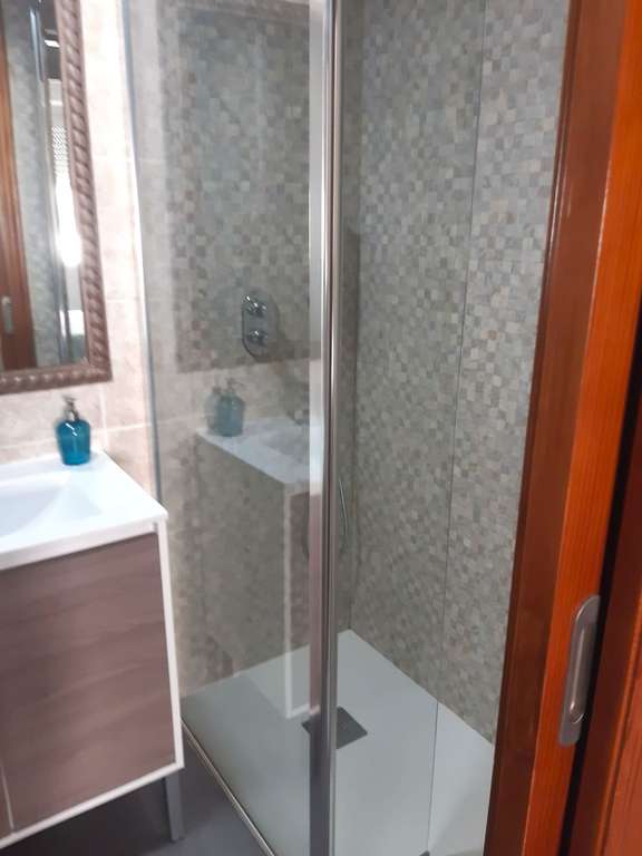 El baño ha sido actualizado recientemente con una elegante ducha y mampara de vidrio, aportando un toque moderno y funcional. Además, los armarios empotrados en el pasillo ofrecen un extra de almacenamiento, optimizando cada espacio de la vivienda.
