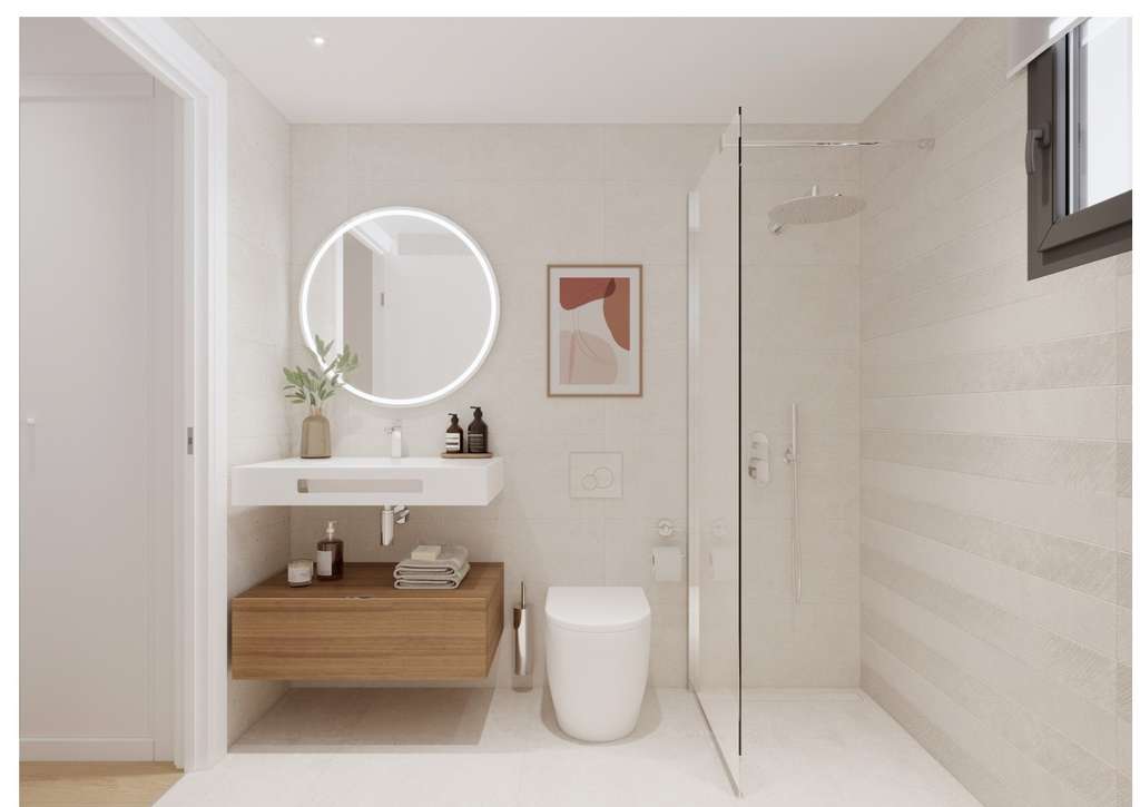 Todas las viviendas vienen de serie con acabados de Porcelanosa , domótica, persianas inteligentes con anemómetro, cocina totalmente equipada, suelo radiante, wifi de alta cobertura, ventiladores en todos los dormitorios, termostatos digitales y puerta de entrada blindada.