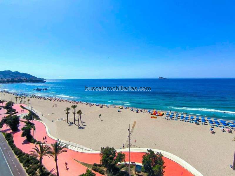 Ático esta ubicado en Benidorm zona 1ª Linea playa Poniente, tiene superficie construida 100 m2. Propiedad ofrece gran luminoso salón-comedor con amplias ventanas y vistas magnificas al mar y Benidorm, cocina americana moderna con electrodomesticos de lujo, 2 habitaciones dobles, 2 baños. Propiedad es recien reformada en estilo moderno con acabados de alta calidad, cocina totalmente equipada, carpinteria interior de lacado blanco, orientación sureste, suelo de mármol, carpinteria exterior de aluminio / climalit. Edificio tiene salida directa a la playa y paseo maritimo de Benidorm. Al lado hay nuevo parking publico, graduito y bastante grande.