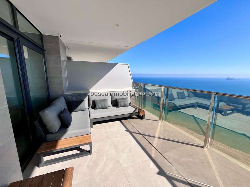 Inmobiliaria LES DUNES presenta excepcional ático con un amplio solarium privado de más de 130 metros cuadrados en la planta superior en la exclusiva urbanización Sunset Cliffs en Benidorm, con espectaculares vistas al Mediterráneo.