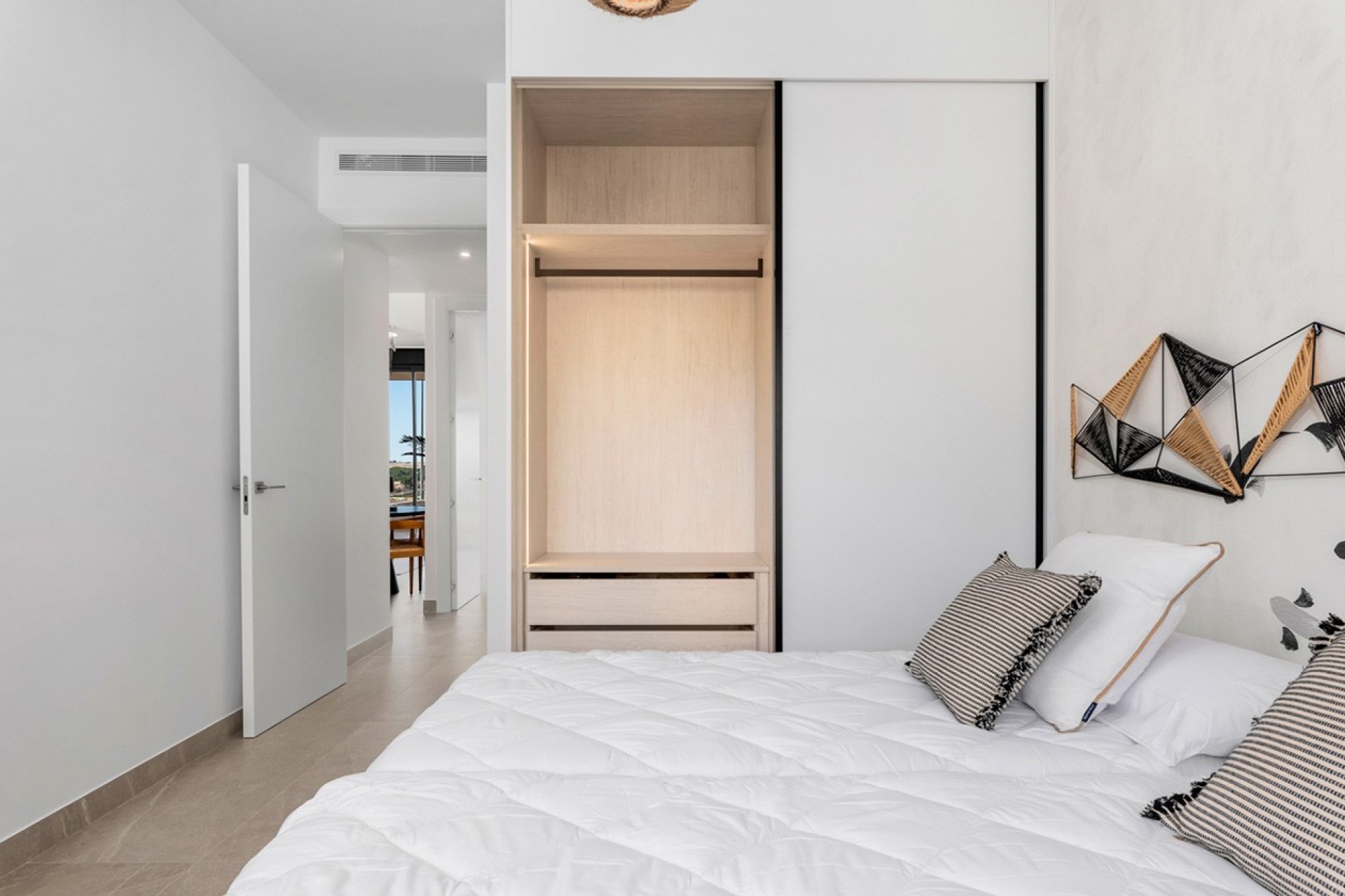 Fachada con acabados modernos y amplias zonas comunes.Carpintería de aluminio o PVC (según modelo) con rotura de puente térmico para aislamiento acústico.Ventanas con rotura de puente térmico.Puertas de seguridad y puertas de paso lisas lacadas en color blanco.Armarios empotrados forrados con textil, cajoneras y luces LED en su interior.Puntos de TV en salón y dormitorios.Cocinas con muebles altos y bajos, bancada de Silestone o similar, fregadero con grifo, 3 enchufes y luces LED.Azulejos porcelánicos artísticos en baños, con mamparas de cristal en la ducha, muebles de baño y espejos.Preinstalación de aire acondicionado por conductos en toda la vivienda.Persianas eléctricas.Calentador de aerotermia de 200L.Videoportero automático con Wi-Fi.Piscina comunitaria de diferente medida según el residencial.