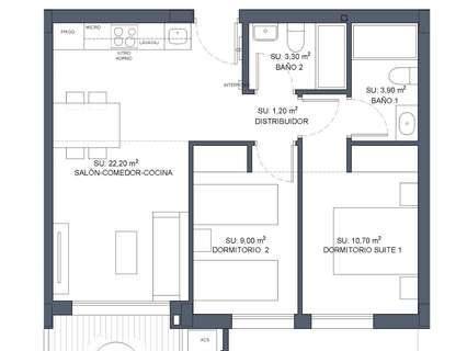Viviendas modernas de nueva construcción con cocina americana y salón, 2 y 3 dormitorios, 2 baños, terrazas.