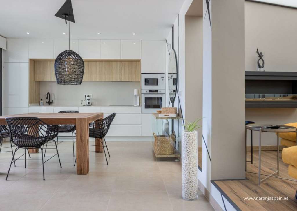La vivienda cuenta con un luminoso salón-comedor de concepto abierto conectado a una cocina moderna totalmente equipada. Grandes ventanales aportan abundante luz natural y acceso directo a la terraza y a la piscina privada climatizada mediante bomba de calor.