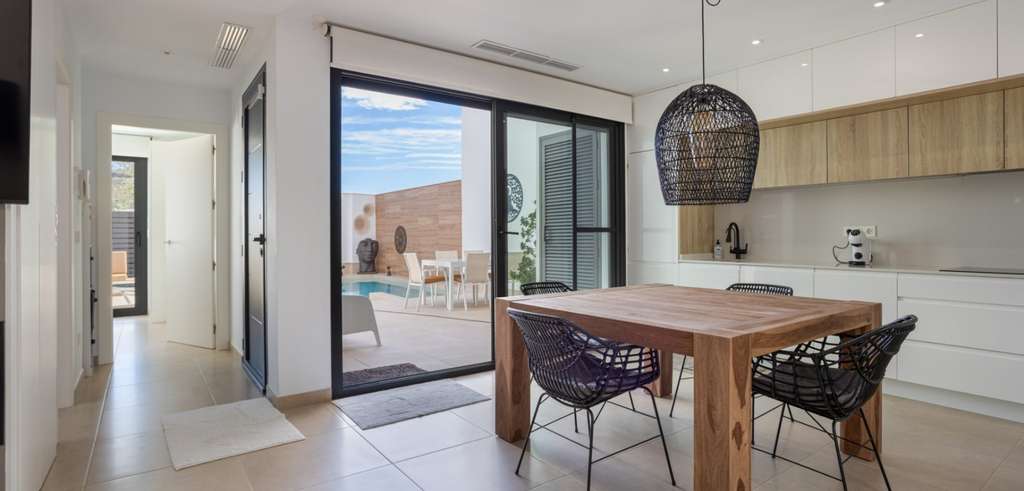 La vivienda cuenta con un luminoso salón-comedor de concepto abierto conectado a una cocina moderna totalmente equipada. Grandes ventanales aportan abundante luz natural y acceso directo a la terraza y a la piscina privada climatizada mediante bomba de calor.