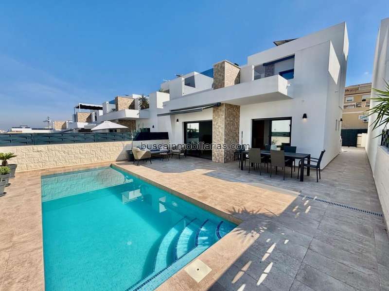 Descubre la esencia de la vida moderna en esta impresionante villa contemporánea con piscina privada y vistas a la montaña, situada en la encantadora localidad de Benijófar, en el corazón de la Costa Blanca.
