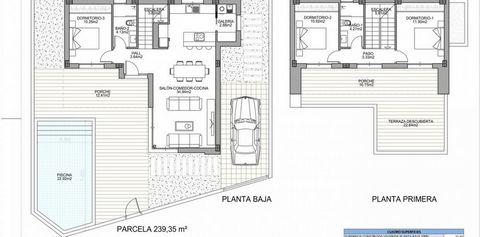 Es una villa de estilo moderno que consta de amplio salón-comedor con cocina americana, 3 dormitorios (uno de ellos en suite) y 2 baños.