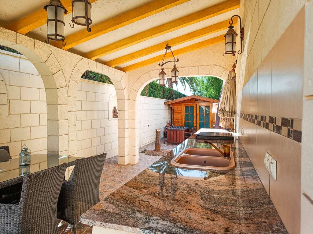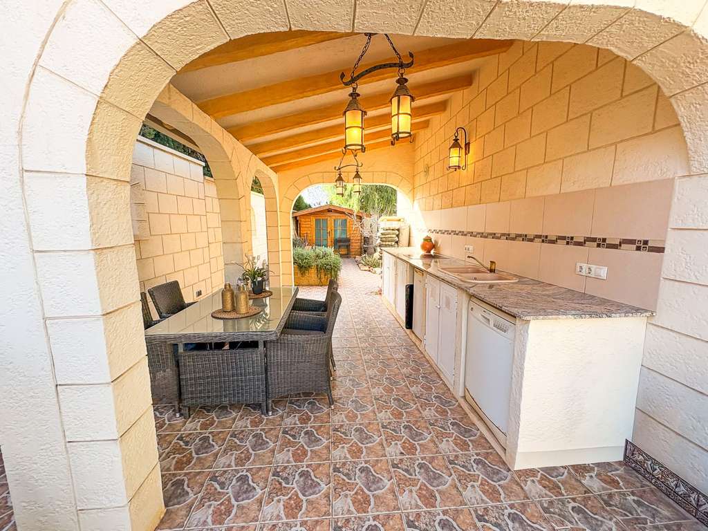 En el exterior, la parcela ofrece varias terrazas, cocina exterior, zonas verdes cuidadosamente integradas y árboles frutales como higueras y melocotoneros, creando un entorno natural y agradable. La propiedad dispone de parking cubierto y una piscina climatizada, perfecta para disfrutar durante todo el año.
