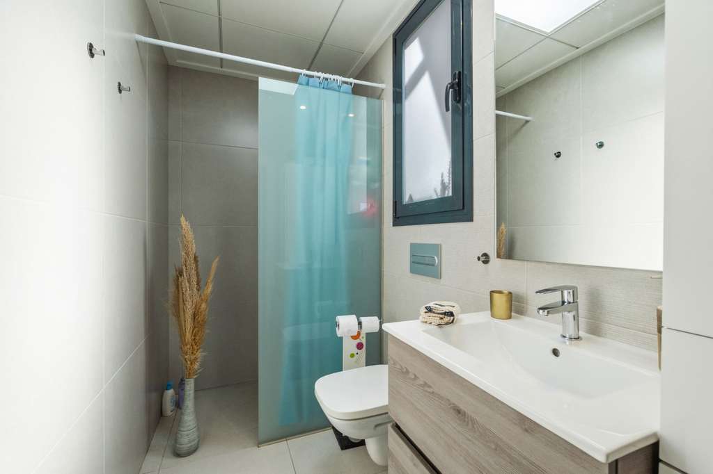 En la planta superior se encuentran dos amplios dormitorios dobles que comparten un moderno baño con ducha tipo walk-in. Además, en la planta baja hay un segundo baño con ducha, ideal para invitados. Desde uno de los dormitorios se accede directamente a un amplio solárium privado de 32 m², perfecto para relajarse, disfrutar del sol o contemplar las vistas despejadas.