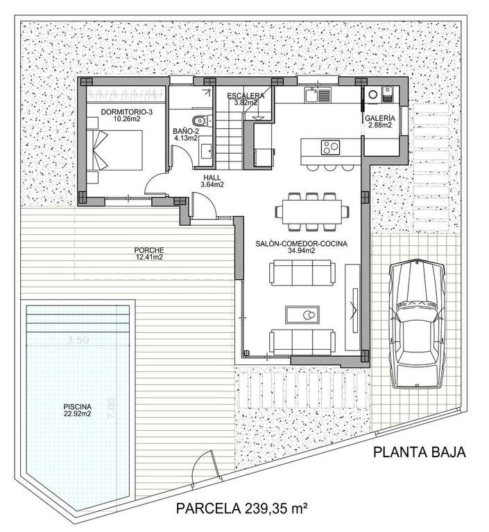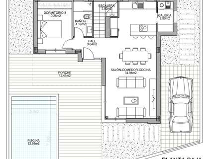 Es una villa de estilo moderno que consta de amplio salón-comedor con cocina americana, 3 dormitorios (uno de ellos en suite) y 2 baños.