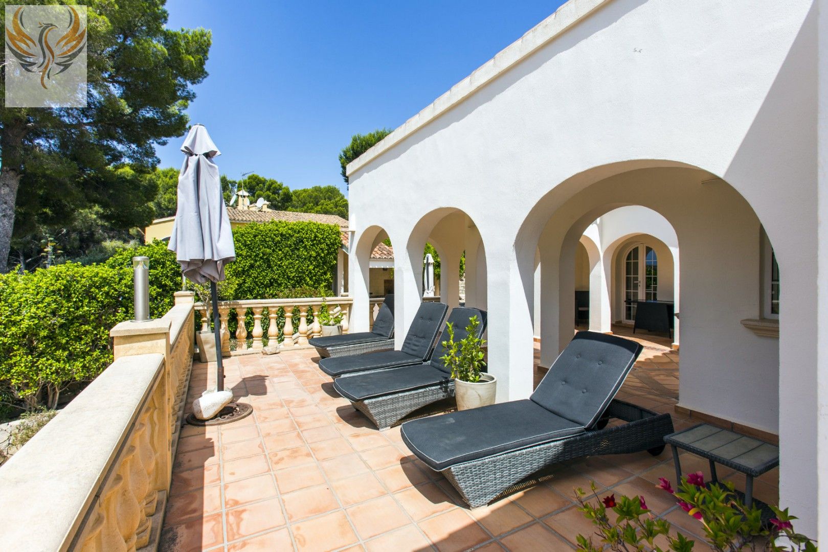 EN EL EXTERIOR TIENE UNA BARBACOA TOTALMENTE EQUIPADA Y ZONA DE ESTAR, GRANDES TERRAZAS ALREDEDOR DE LA PISCINA, UNA DUCHA EXTERIOR, JARDINES MADUROS Y BIEN MANTENIDOS Y UNA COCHERA DOBLE.
