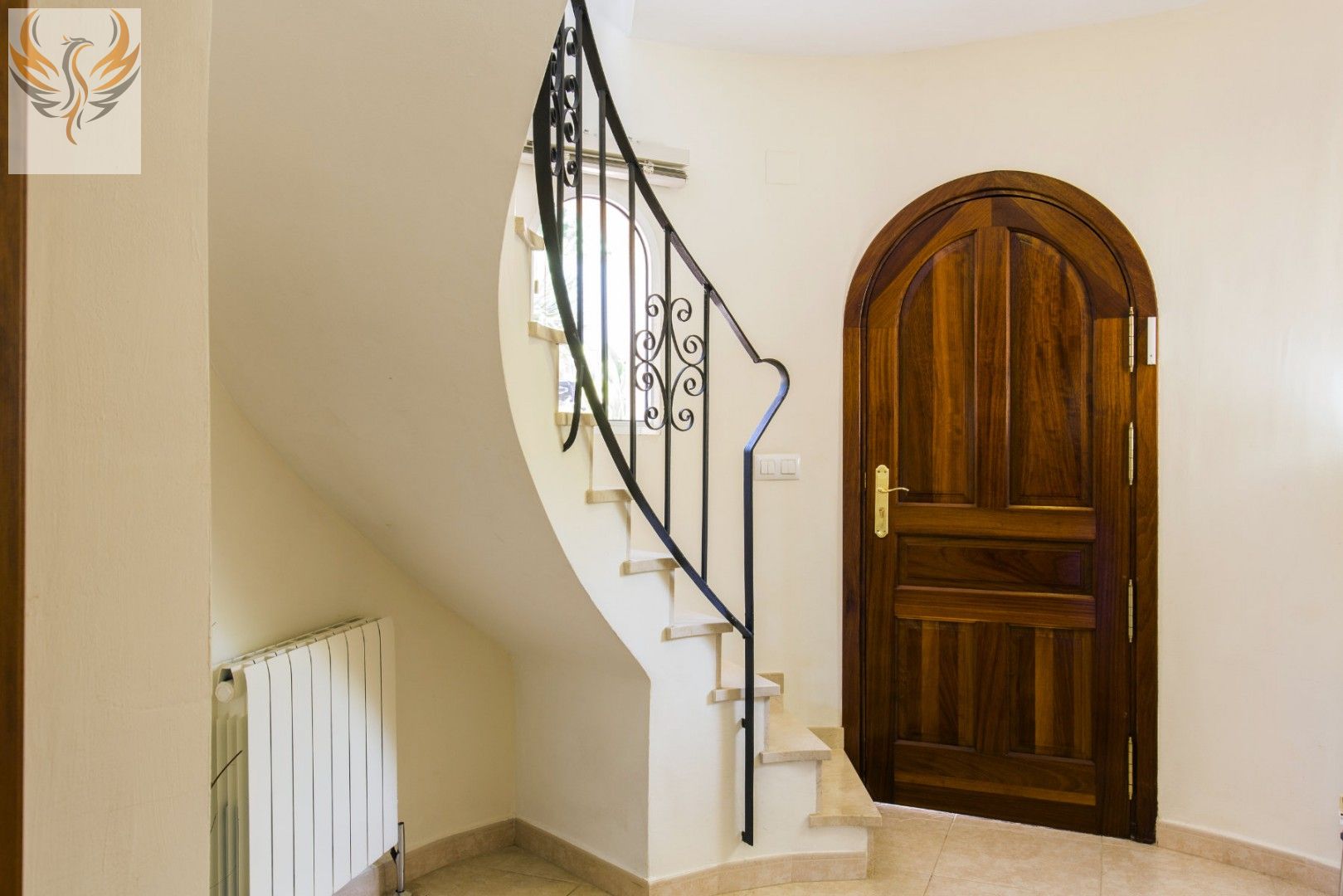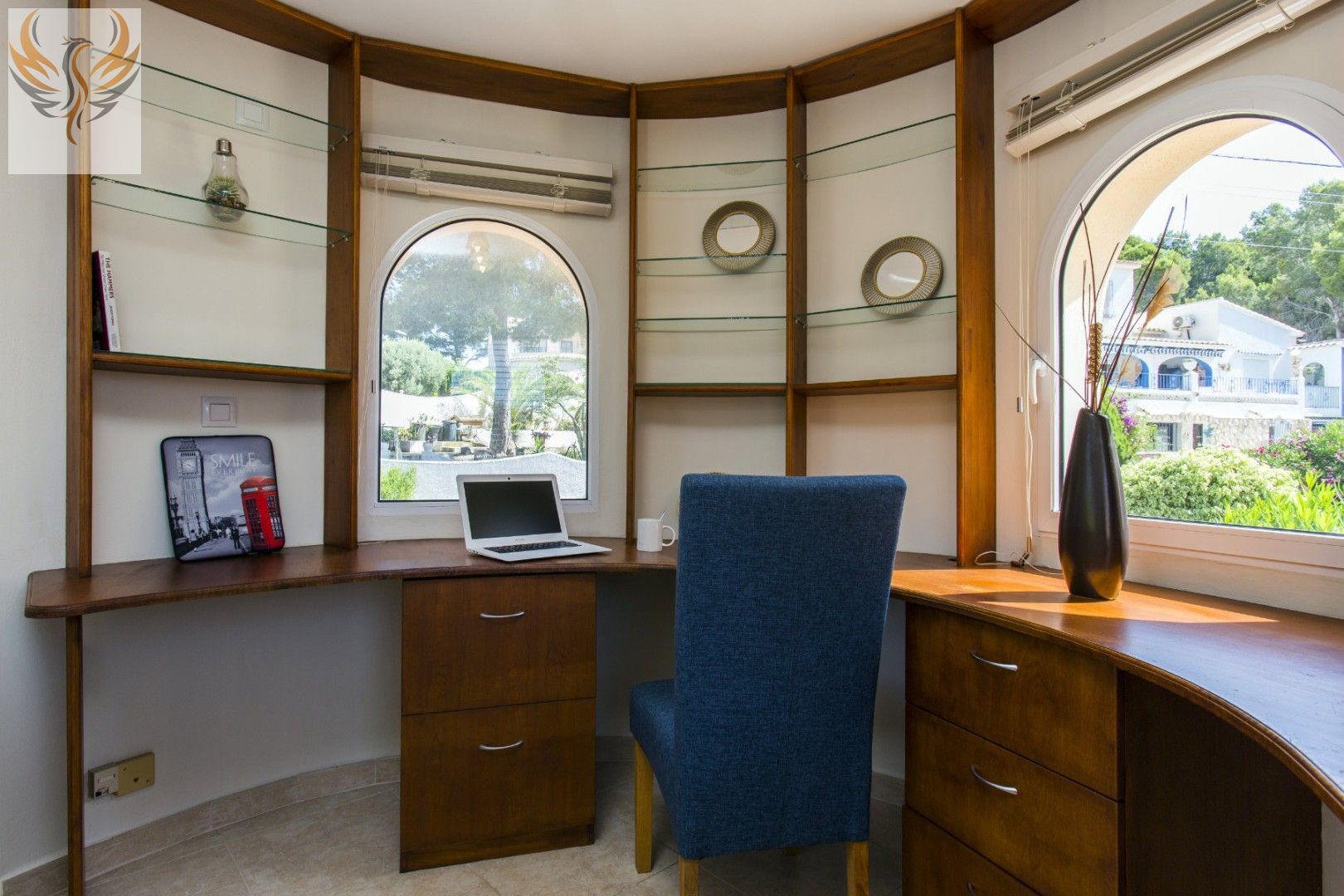 La casa principal consta en la planta baja de un amplio salón, gran cocina separada, ambos con salida a la amplia naya con vistas al mar, un aseo de invitados y un dormitorio doble con baño en-suite. En el hall de entrada, una escalera conduce a la torre con un estudio.