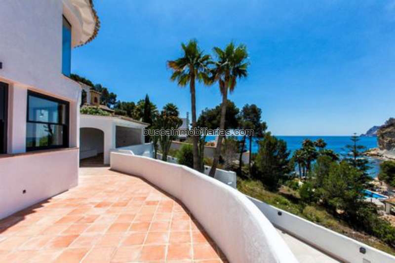 Villa moderna con vistas al mar en Cala Advocat - ubicación tranquila cerca de Moraira Esta elegante villa reformada de estilo moderno/ibicenco con fantásticas vistas al mar se encuentra en la codiciada zona residencial de Cala Advocat en la Costa Blanca, a sólo 9 minutos en coche del encantador pueblo costero de Moraira. Tras una reforma integra, la propiedad combina el encanto mediterráneo con el confort de la vida moderna - ideal para cualquiera que busque algo especial. La villa orientada al sur impresiona por su soleada ubicación y sus ininterrumpidas vistas al mar. En la planta baja le esperan dos dormitorios con elegantes armarios empotrados y con sus baños en suite, un aseo de cortesía y una acogedora sala de estar con chimenea de leña. Desde aquí podrá disfrutar de una vista ininterrumpida del agua, perfecta para relajarse por la noche con la familia o los amigos. Una elegante escalera interior conduce a la planta inferior que cuenta con una cocina equipada de planta abierta y luminosa con barra (que puede utilizarse tanto en el interior como en el exterior), acceso directo a la terraza y dos dormitorios más con elegantes armarios empotrados y con baños en-suite. Uno de ellos ofrece acceso directo a la amplia terraza soleada y el otro a una terraza privada en la parte trasera de la casa. Además encontramos otro aseo de cortesía, así como el lavadero. La zona exterior incluye una zona cubierta para sentarse con una una barbacoa de obra y una práctica ducha exterior al lado de la piscina. Las diferentes terrazas ofrecen mucho espacio para tumbonas, ideal para relajarse bajo el sol mediterráneo. A nivel de la piscina, encontramos un cuarto independiente para convertirlo en un pequeño gimnasio o bodega. Ofrecemos una exclusiva experiencia de vida con vistas al Mediterráneo. La villa dispone de todas las comodidades para ser su nuevo hogar permanente, incluyendo aire acondicionado caliente/frio, ventas de alta calidad con doble cristal, sistema de alarma, así como una instalación fotovoltaica. Hay un carport con puerta corredera para un coche y otro aparcamiento detrás de la casa barbacoa. Esta villa es adecuada tanto como vivienda permanente como casa de vacaciones. No espere más y póngase en contacto con nosotros hoy para una visita. El precio mostrado no incluye impuestos ni gastos de compra / La oferta está sujeta a errores, cambios de precio, disponibilidad, omisión y/o retirada del mercado sin previo aviso / Muebles y contenidos según acuerdo personalizado y no según las fotos de la presentación[IW]