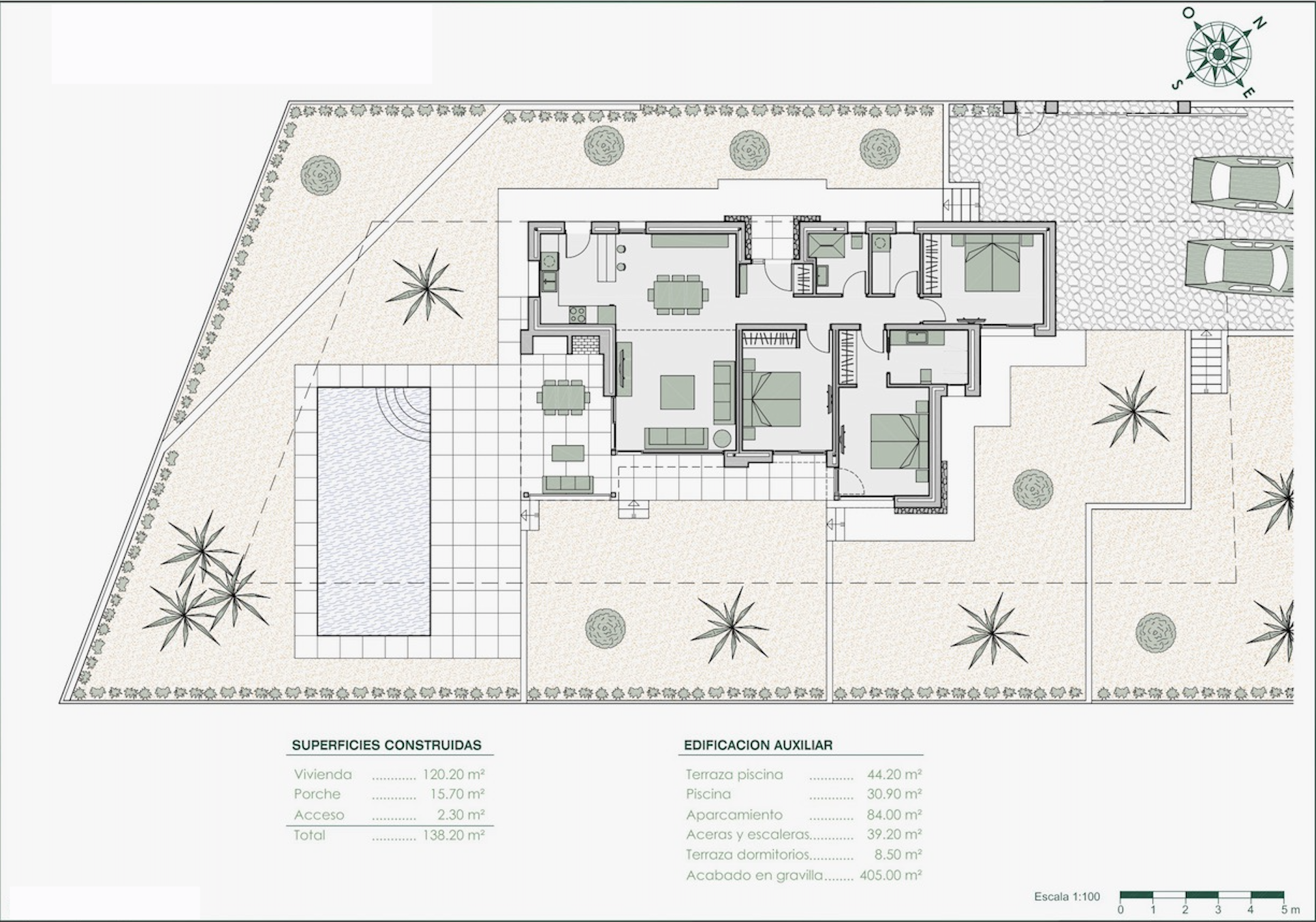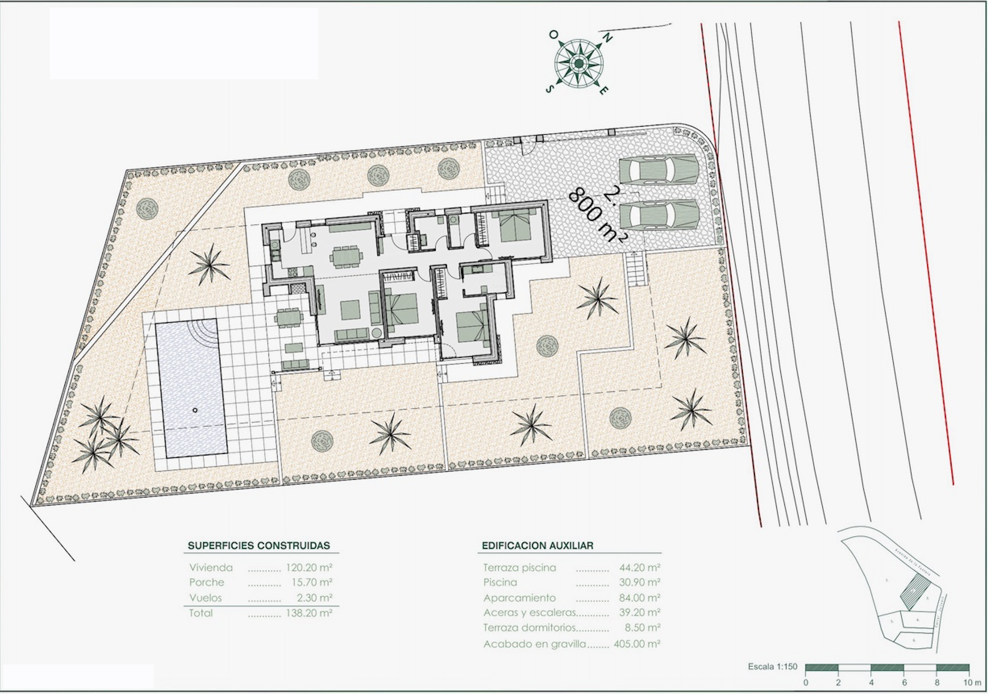 Distribuida toda en una planta, convirtiéndola en una casa práctica y funcional. Desde la entrada se accede al hall, en el lado derecho tenemos la zona de diario, donde podemos encontrar la cocina totalmente abierta al comedor y al salón desde donde se accede directamente a la terraza, al porche exterior y a la barbacoa. En el lado izquierdo accedemos a la zona de noche distribuida en 3 habitaciones. La habitación mas-ter que dispone de baño individual además de vestidor y las otras dos habitaciones que comparten baño. En este lado de la casa también hay una zona de lavandería.En la terraza exterior encontramos la piscina con una zona de relax para disfrutar del sol o de una cena en la barbacoa. Así como el acceso a las zonas ajardinadas.