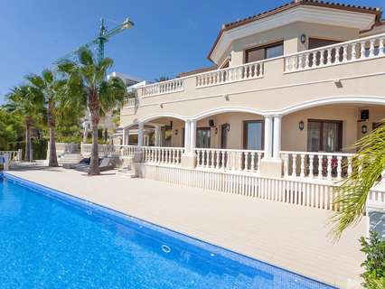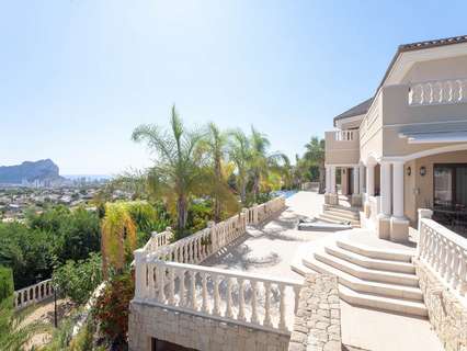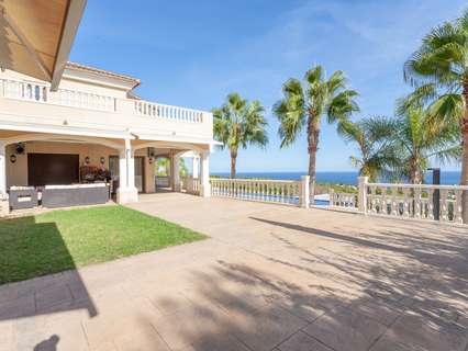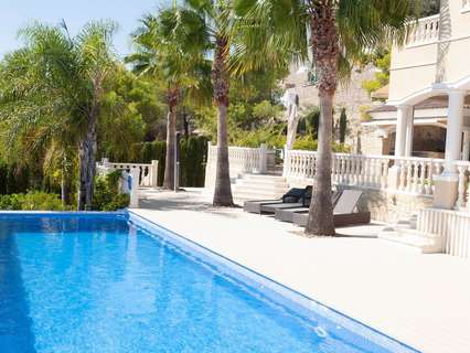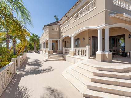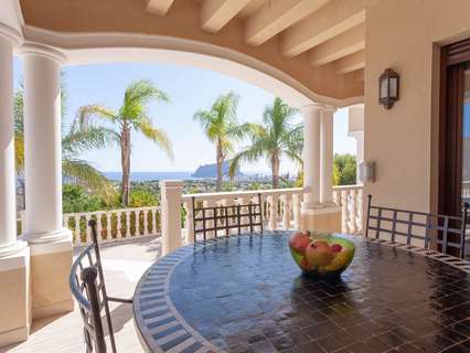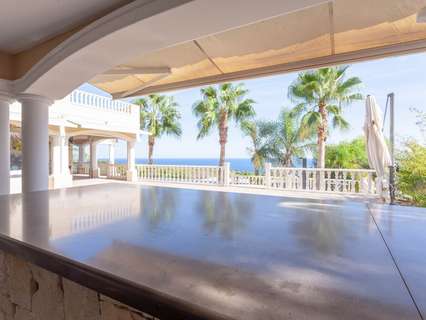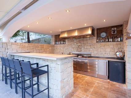 Exclusiva villa de lujo estilo mediterráneo con vistas al mar en venta en urbanización Raco de Galeno Benissa en la costa Blanca de Alicante en España, 890 m2 construidos en una parcela de 1.850 m2 con piscina «Infinity» con una superficie de 80 m2 , construida en 2014. La casa tiene 3 plantas conectadas por escaleras de madera natural y ascensor, 5 dormitorios, 5 baños, 2 aseos, salon comedor con chimenea, cocina totalmente equipada estilo clásico con madera natural, piscina, terraza, barbacoa, cocina de verano, gimnasio, guardarropa, lavandería, sauna, jacuzzi, garaje con espacio para 4 coches, calefacción por suelo radiante, aire acondicionado frio / calor con sistema Airzone, paneles solares y una sala de servidores. Exterior con jardín maduro y un estacionamiento exterior, donde se pueden colocar hasta 5 autos en un lugar acogedor bajo las palmeras.