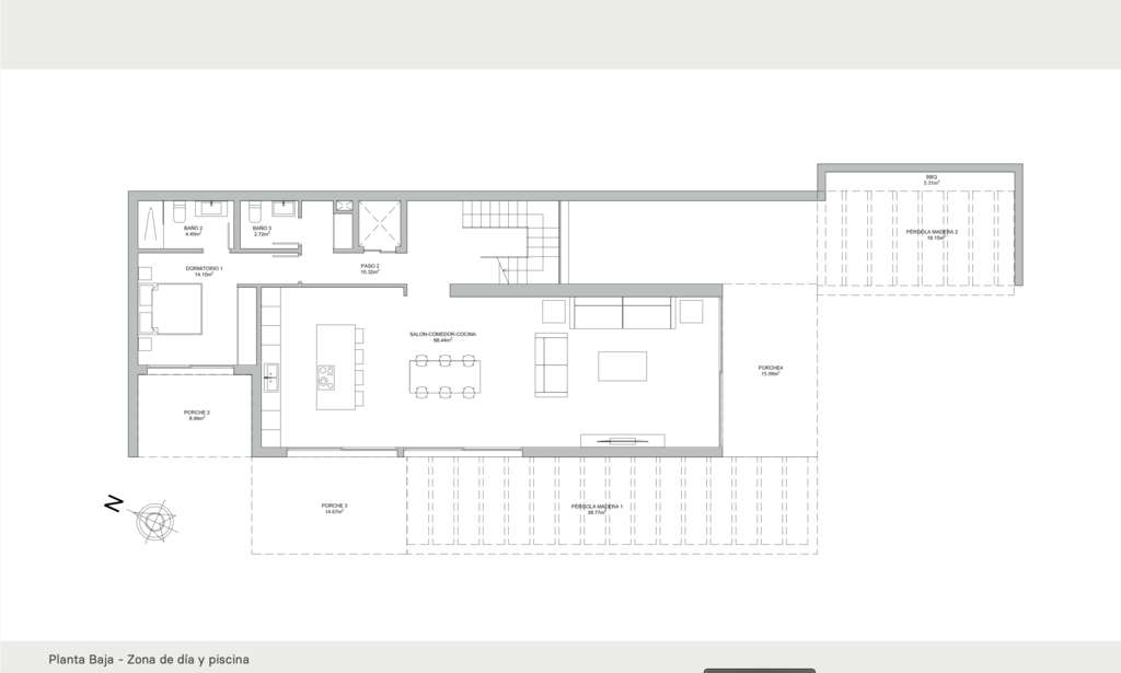 En planta baja se distribuye la zona de día completamente abierta, salón-comedor-cocina, pudiéndose proyectar hacia el exterior. Además, un dormitorio en suite y un aseo para la zona de día. Todo ello conectado con una fantástica terraza exterior con piscina, una espaciosa zona de barbacoa exterior, rodeado por vegetación autóctona de la zona. En planta alta se distribuyen tres dormitorios, todos ellos en suite y con vestidor propio. Dos de ellos cuentan con acceso a terrazas independientes. Por último, la villa cuenta con una planta sótano para dos vehículos, un gimnasio o cualquier otra instalación según el deseo del nuevo propietario y un aseo.