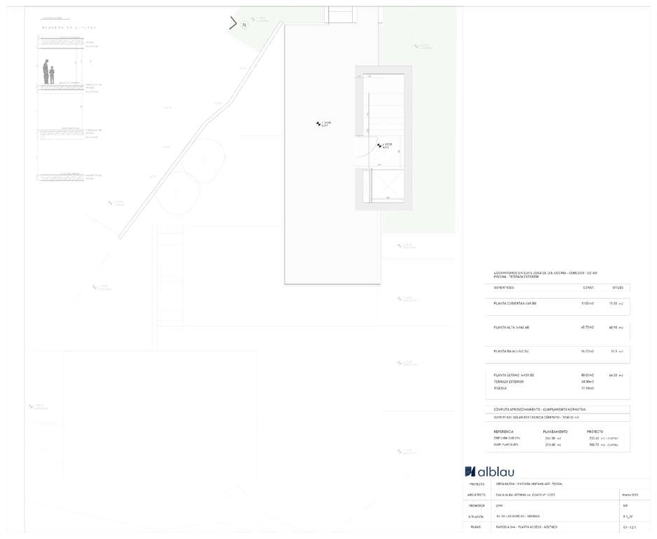 Aparcamiento: zona de aparcamiento a nivel de la calle con entrada peatonal. Escalera exterior que lleva a la entrada de la villa, con escaleras internas y ascensor. Si se desea, existe la opción de instalar un segundo ascensor desde la zona de aparcamiento hasta la entrada de la casa para un acceso totalmente sin escaleras desde el aparcamiento. Entrada: nos encontramos en una gran terraza plana con vistas panorámicas al mar. En este nivel se encuentra el vestíbulo con escalera y ascensor.