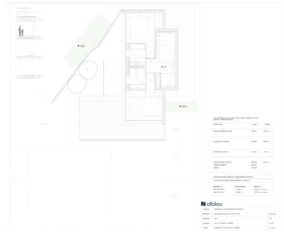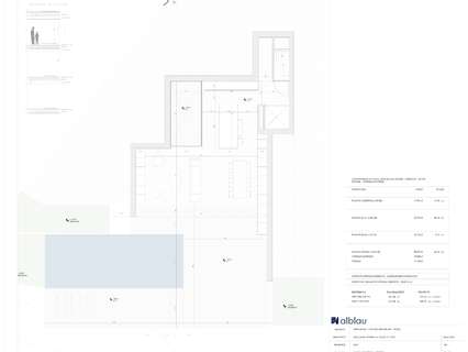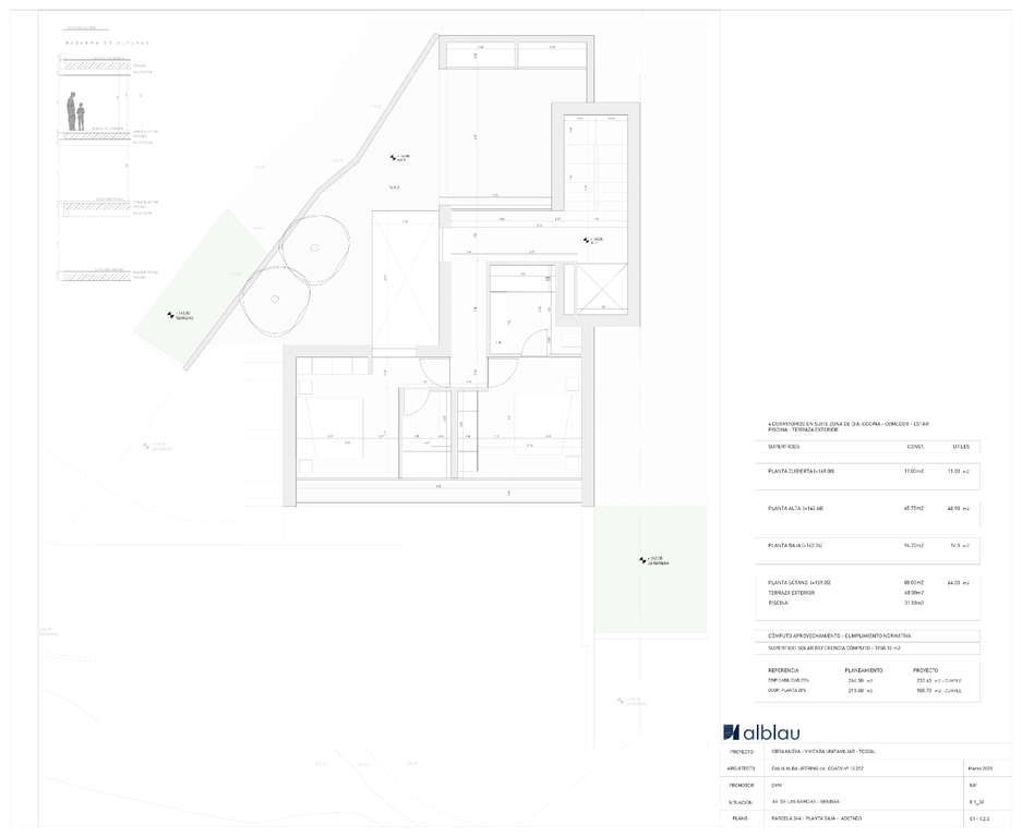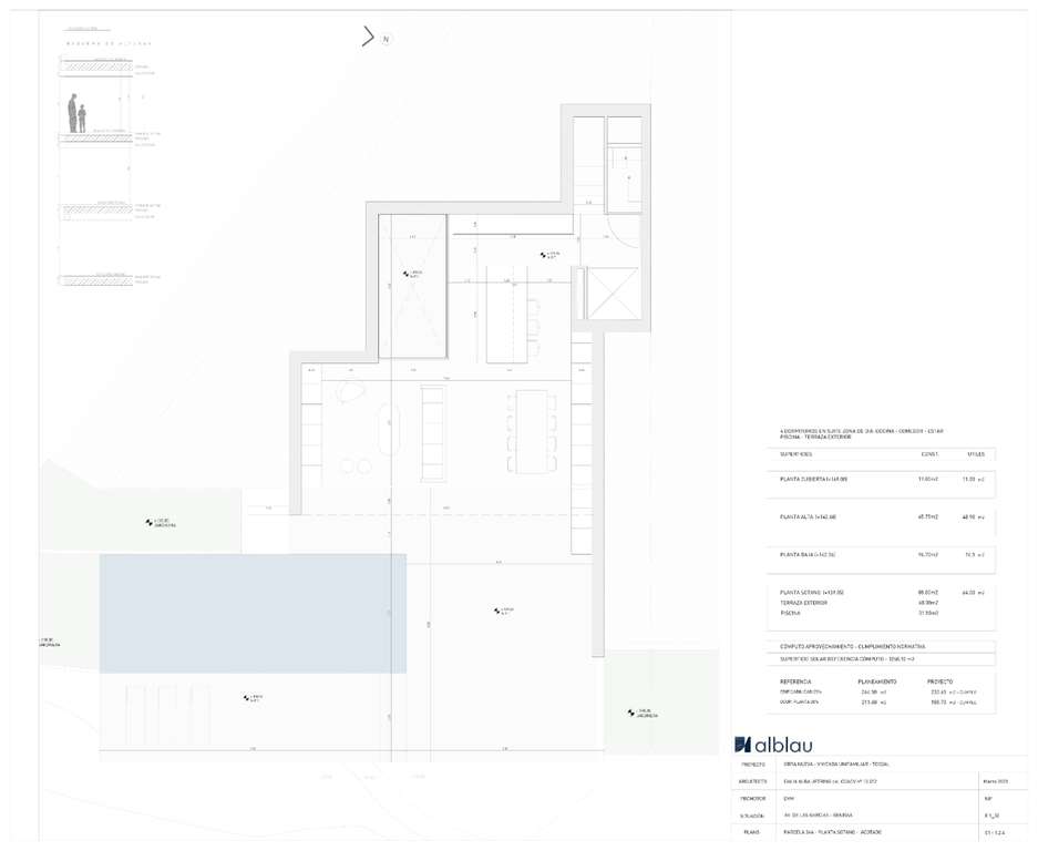Planta baja: el área de estar con cocina completamente equipada y abierta con isla, salón-comedor y baño de invitados. En el exterior, accedemos a una zona de barbacoa, terrazas, jardín y piscina. Esta área no solo se beneficia de la luz natural a través de las grandes ventanas panorámicas que ofrecen una gran vista al mar, sino que también presenta un punto destacado especial: un patio con luz natural desde el sureste.