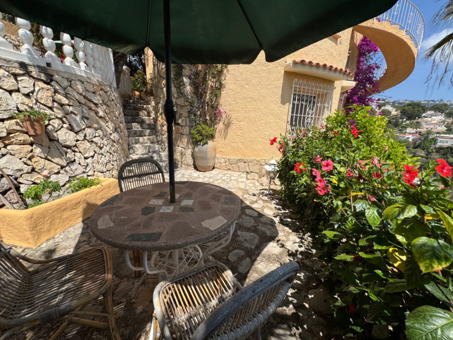 Villa romántica y tradicional con mucho encanto, diferentes terrazas para sentarse, jardín maduro con árboles y flores, muy privada, en una zona consolidada, a poca distancia de Cala Baladrar, ideal para clientes que buscan algo especial difícil de describir. Esta encantadora villa ofrece vistas al mar y mucha privacidad. Se encuentra a solo 700 metros de la pintoresca Cala Baladrar de Benissa y está situada en una parcela en pendiente completamente cercada, con acceso desde dos calles, un jardín y espacio disponible para construir una piscina.