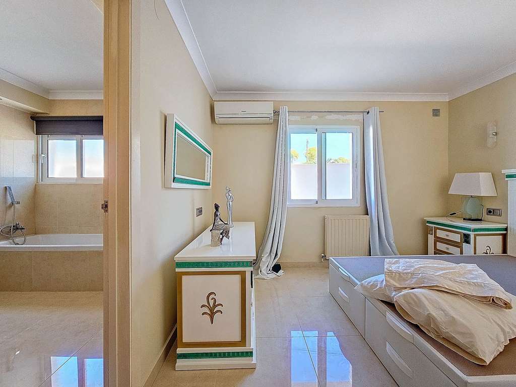 Una elegante escalera te lleva a la planta superior, donde encontrarás espacio adicional de almacenamiento y acceso a un estrecho balcón que rodea la parte trasera y lateral de la villa. Este balcón es accesible desde dos dormitorios. Aquí también encontrarás un dormitorio con armarios empotrados y baño en suite con bañera, así como un dormitorio con armarios empotrados y baño en suite con ducha. Este dormitorio también proporciona acceso a una amplia terraza.