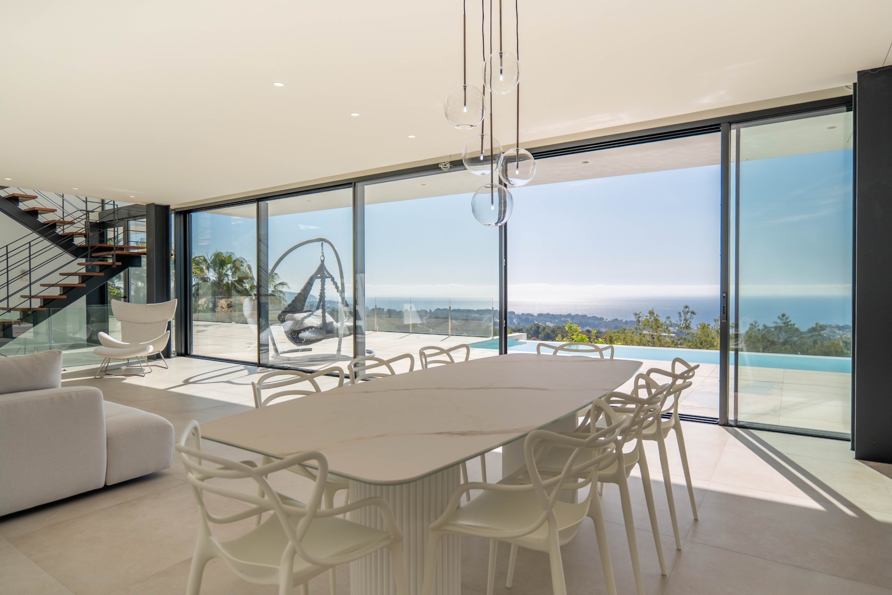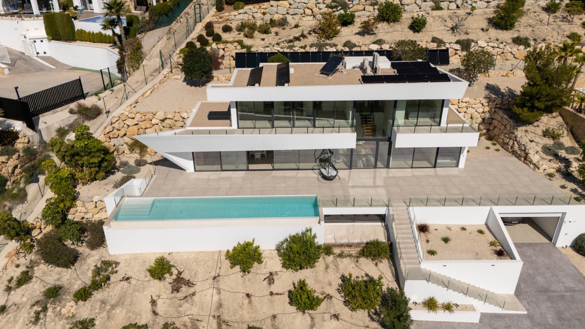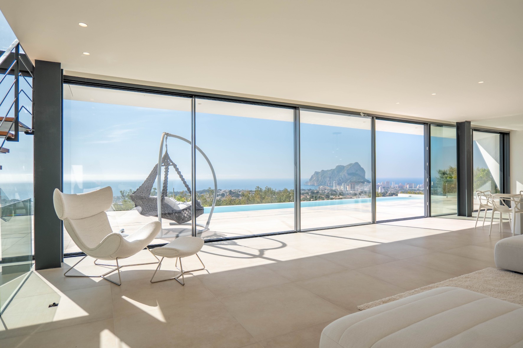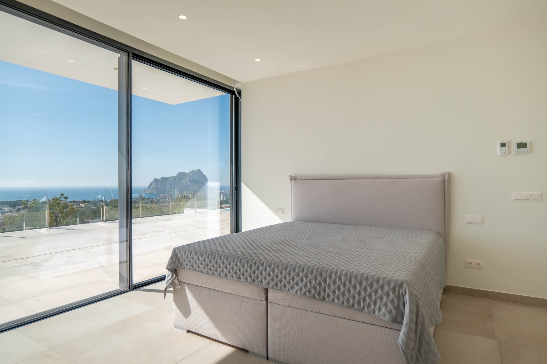 Nueva y moderna villa en venta en Calpe y Benissa, en una parcela de grandes dimensiones con impresionantes vistas panorámicas al mar y al Peñón de Ifach.Esta exclusiva propiedad, construida en 3 plantas con materiales de alta calidad, ofrece una experiencia de lujo incomparable. En la planta semisótano, encontrarás un garaje para dos coches, una zona diáfana de más de 100 m² perfecta para un gimnasio o sala de juegos, y un ascensor que conecta todas las plantas.La planta baja incluye un espacioso salón-comedor, cocina moderna, aseo de cortesía, y un dormitorio principal con vestidor y baño en suite, todo con acceso directo a la terraza y la piscina. La piscina, de más de 15 metros de longitud y con desbordamiento, es ideal para disfrutar del clima mediterráneo.En la planta alta, hay tres dormitorios de invitados, cada uno con acceso a una terraza cubierta, proporcionando un espacio privado y cómodo para todos.La villa está semiamueblada con muebles nuevos y equipada con suelo radiante y aire acondicionado por conductos. Además, cuenta con un jardín mediterráneo con riego automático incluido en el precio.No pierdas la oportunidad de vivir en esta lujosa villa de nueva construcción en una de las zonas más exclusivas de Calpe y Benissa, con vistas espectaculares y acabados de alta gama. ¡Contáctanos hoy para más información!