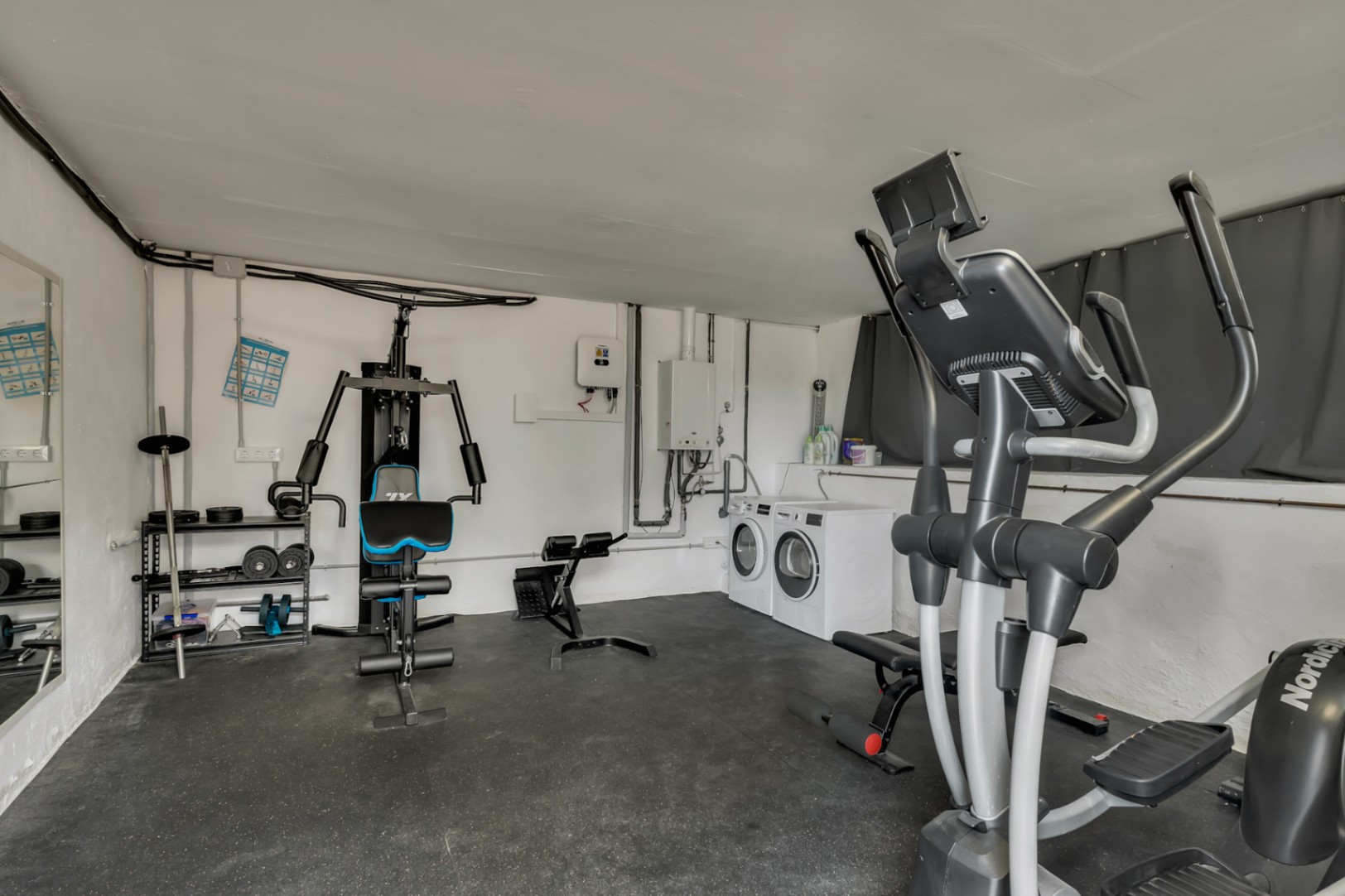 En la planta inferior, completamente independiente, consta de: a) gimnasio y lavadero. B) apartamento de invitados con: porche acristalado, salón-comedor-cocina, 1 dormitorio doble y 1 aseo con ducha.