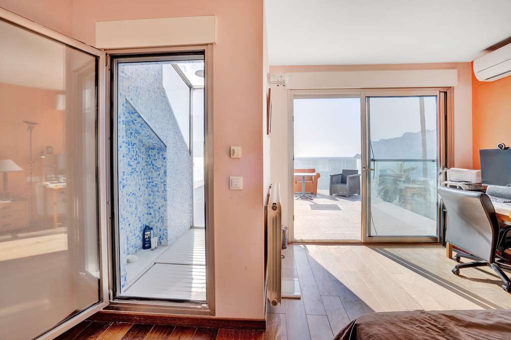 Subiendo a la planta superior, encontrará dos generosos dormitorios en suite, cada uno con acceso directo a una terraza privada con vistas inigualables al Mediterráneo.