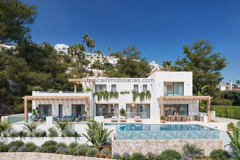 Villa de lujo con vistas panorámicas al mar4 dormitorios, 4 baños en suite, 2 aseos para invitadosSalón-comedor-cocina de concepto abiertoSuperficie construida: 394 m² | Parcela: 1.142 m²Gran terraza sur, parcialmente cubierta para comer o relajarseCine en casa, gimnasio, lavadero y trasteroPosibilidad de incluir garajeAire acondicionado centralizado, armarios empotradosJardín fácil de mantener, puerta eléctricaPiscina 5 × 10 m