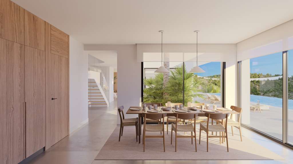 Desde el primer vistazo, Villa Irati impresiona por su arquitectura de líneas limpias, con grandes volúmenes blancos y ventanales de suelo a techo que fusionan interior y exterior. La fachada principal se abre completamente a una gran terraza con piscina infinita, generando una sensación de continuidad entre el salón, el comedor y las vistas panorámicas al Mediterráneo.