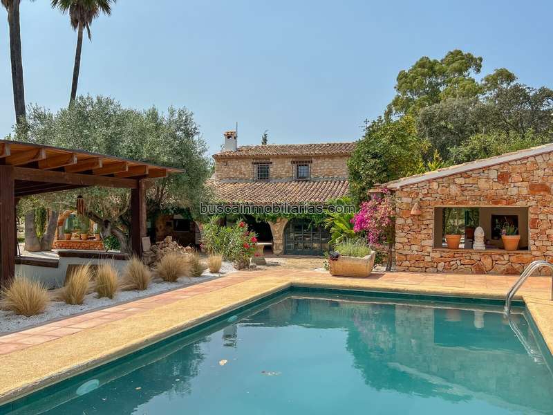 Lujosa Finca en venta en Benissa, a pocos minutos de servicios.Situada en la zona agrícola entre las localidades de Senija y Benissa, esta finca bellamente presentada tiene 18.000 metros cuadrados de terreno de cultivo llano y vallado, un establo de caballos independiente (para 5 caballos) y un anexo de invitados independiente de un dormitorio.Detalles de la Finca:Construcción total de 472 m2 que consta de: casa principal de 429 m2 (358 m2 en planta baja, y 71 m2 en primer piso), más anexos adicionales.El edificio principal es una atractiva finca de piedra tradicional por fuera, por dentro tiene un excelente diseño arquitectónico que combina magníficas características tradicionales con tamaños de habitaciones bien proporcionados con un diseño lógico.Todo el día a día principal se sitúa en la planta baja, hay un gran porche con vistas a la piscina, un vestíbulo de entrada con zona de estar y un gran dormitorio principal en suite con vestidor y baño comunicado.La zona de estar es un amplio espacio diáfano con tres zonas de estar, un comedor y dos chimeneas, y también hay una cocina independiente con un comedor adicional con una tercera chimenea y un lavadero contiguo.El primer piso de la finca tiene dos dormitorios de invitados de buen tamaño y un baño con ducha.Externamente, la finca está rodeada de hermosas tierras de cultivo con viñedos y total privacidad, la parcela está completamente cerrada y hay estacionamiento para varios vehículos, un edificio de barbacoa, un área de piscina y un anexo para invitados.Hacia el límite norte de la parcela, hay una zona vallada individualmente con una cuadra para cinco caballos.