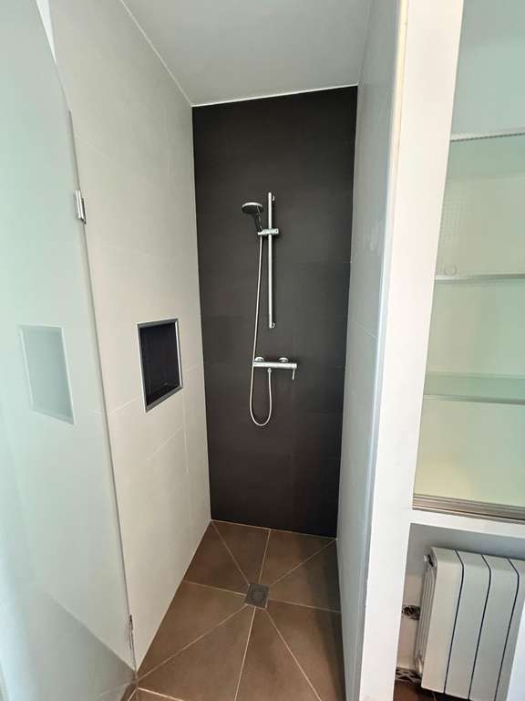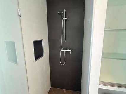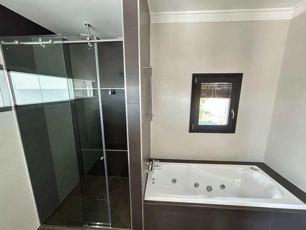Fuera del salón hay un baño privado que cuenta con un lavabo de piedra y una gran ducha tipo lluvia. Existe la posibilidad de cerrar este espacio para crear un dormitorio de invitados adicional, ya que ya hay una entrada exterior independiente a las terrazas y al aparcamiento.