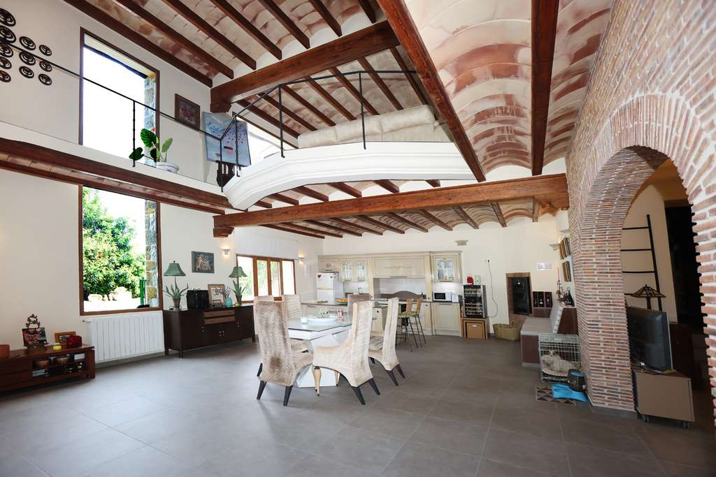 La finca se levanta sobre una impresionante parcela de más de 5.500 m² orientada al sur, lo que garantiza luz natural durante todo el día y unas vistas abiertas que se extienden sobre el valle. Con cerca de 1075 m² construidos, la vivienda principal se distribuye en varios niveles conectados por una elegante escalera integrada en un luminoso patio interior que actúa como eje central de la casa.