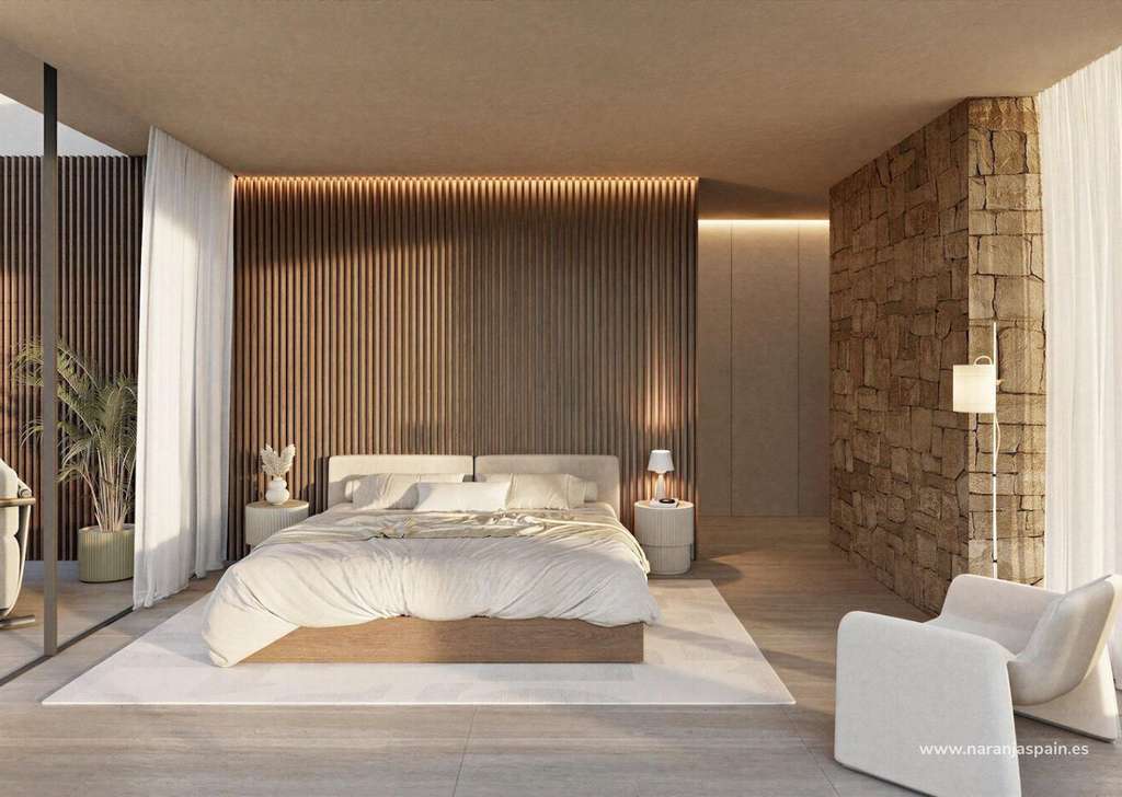 La arquitectura, que combina la calidez mediterránea con la elegancia contemporánea, integra piedra natural, madera y tonos neutros suaves, integrándose a la perfección en el paisaje costero.