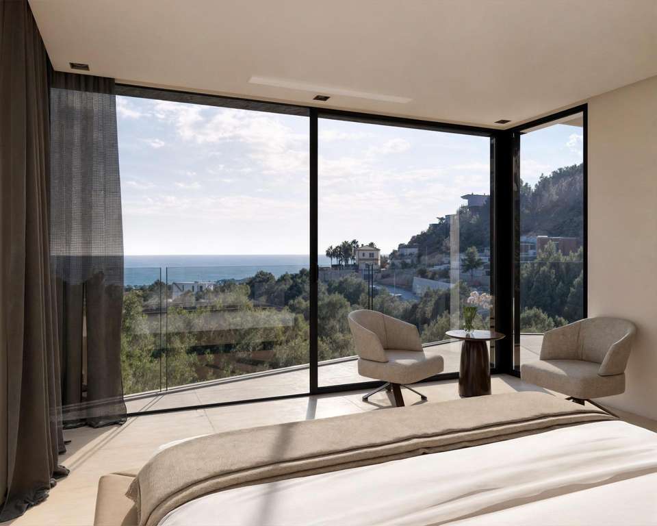 Diseñada para maximizar la luz natural y las espectaculares vistas al mar, la villa presenta una arquitectura contemporánea con grandes ventanales y una integración perfecta entre el interior y el exterior. Distribuida en varios niveles y conectada por un ascensor privado, la casa ofrece cuatro amplios dormitorios, cada uno con su propio cuarto de baño, además de un aseo adicional para invitados. La suite principal cuenta con acceso directo a una terraza privada con vistas panorámicas al Mediterráneo.