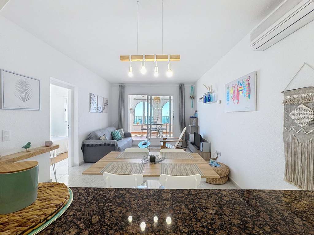 Dos dormitorios dobles con armarios empotrados.Un amplio cuarto de baño reformado, con acabados modernos.Cocina americana totalmente equipada, con vistas abiertas al mar.Luminoso salón-comedor con acceso directo a la terraza.Terraza de 20 m² parcialmente cubierta, ideal para desayunos frente al mar.Tres armarios trasteros que aportan espacio extra de almacenaje.Además, dispone de aire acondicionado frío/calor en el salón-comedor, garantizando confort durante todo el año.