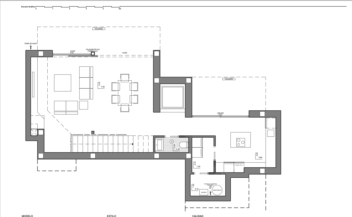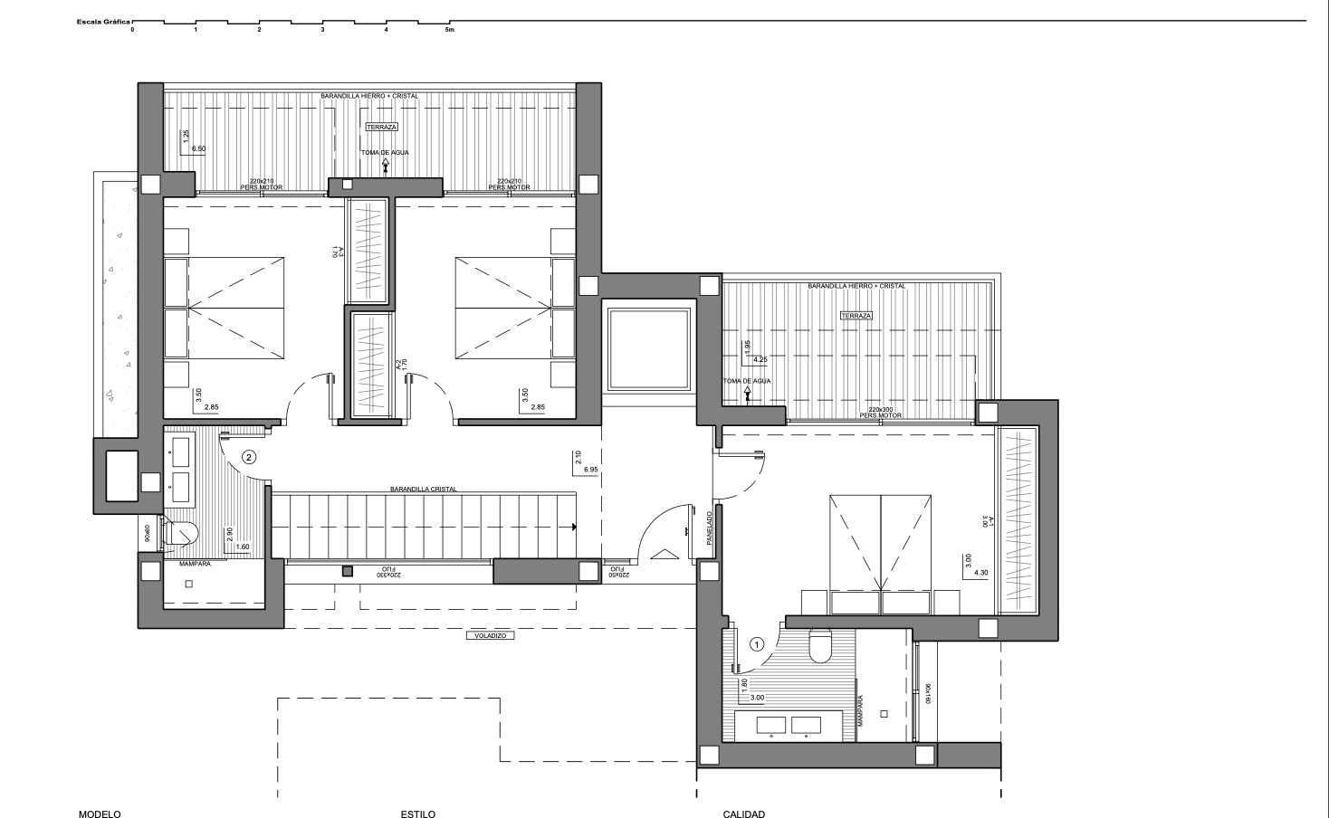 Los espacios exteriores de esta villa de lujo se han cuidado al detalle, jardín adaptado a la parcela, con muros de abancalamiento que generan varios espacios y niveles, y una gran terraza con la piscina infinity que se funde con el mar, son sus elementos más característicos.