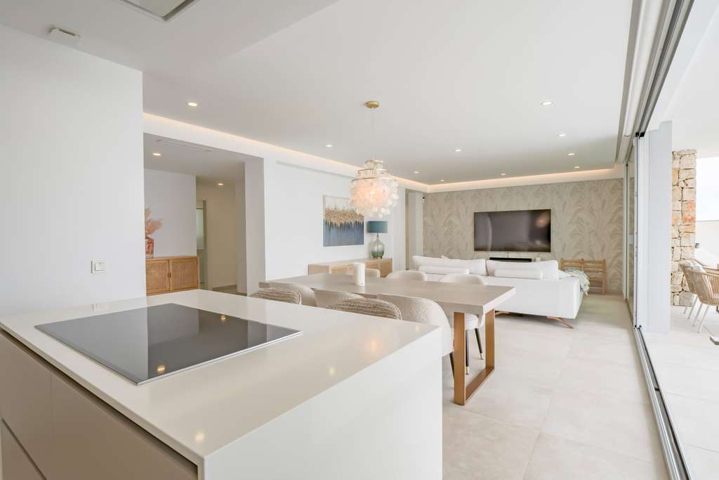 Cocina, sala y comedor con amplios ventanales que traen la sensación de exterior al interior.