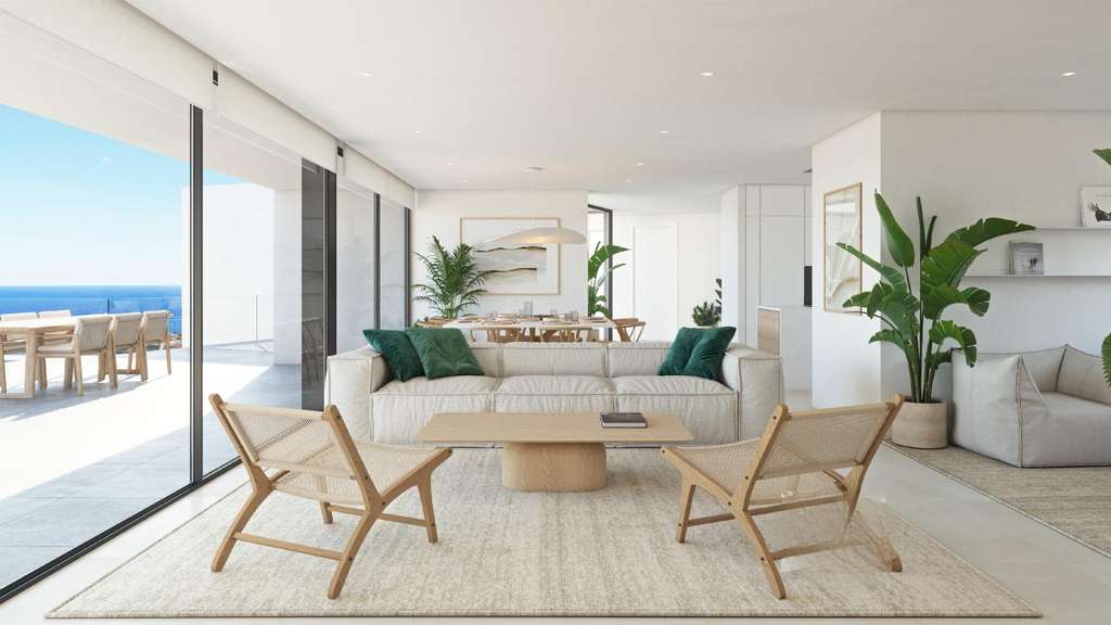 La zona de estar se encuentra en la misma planta. Una espaciosa cocina con isla central y equipada con electrodomésticos de primeras marcas, un gran salón y terraza con unas impresionantes vistas al mar Mediterráneo.