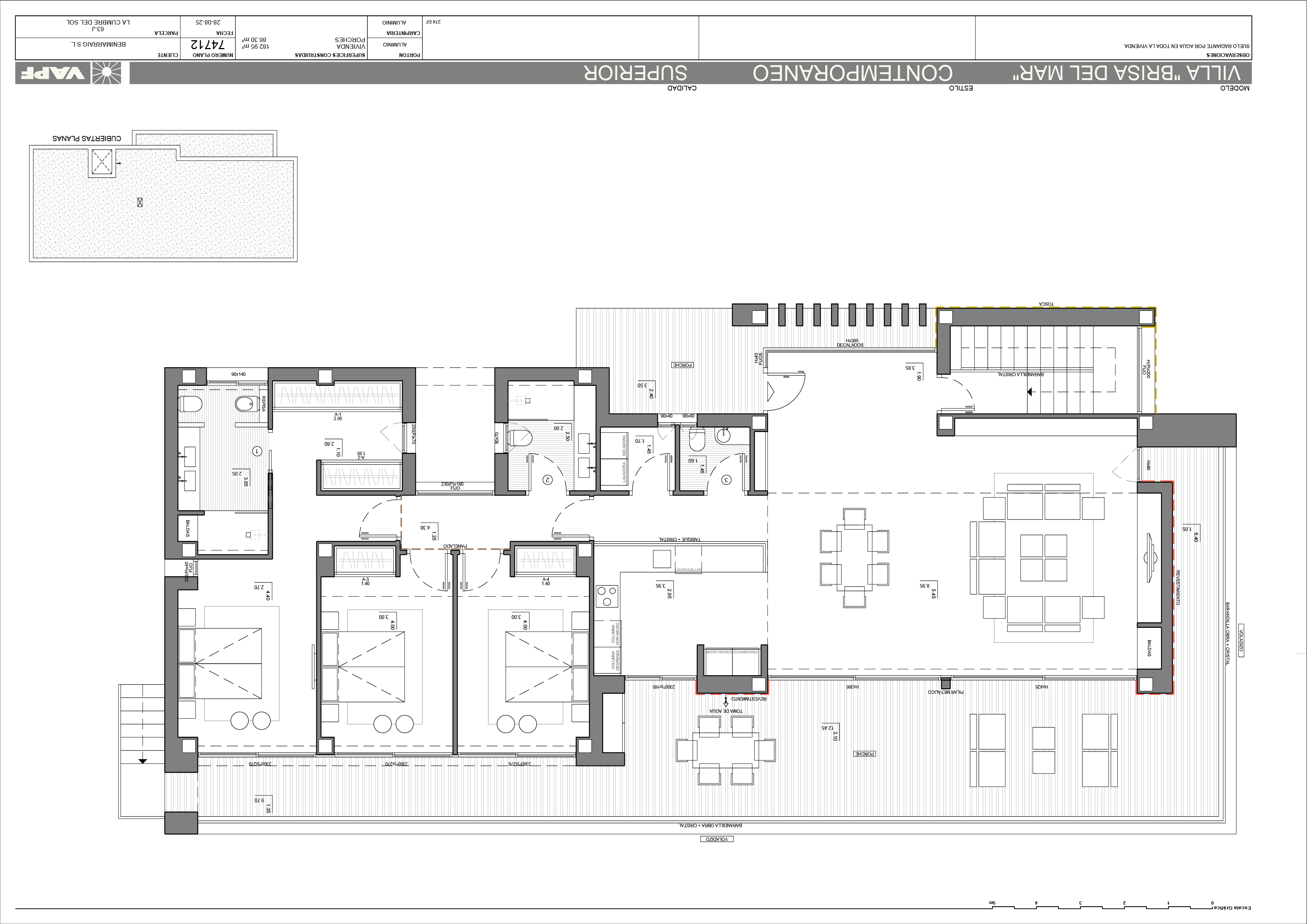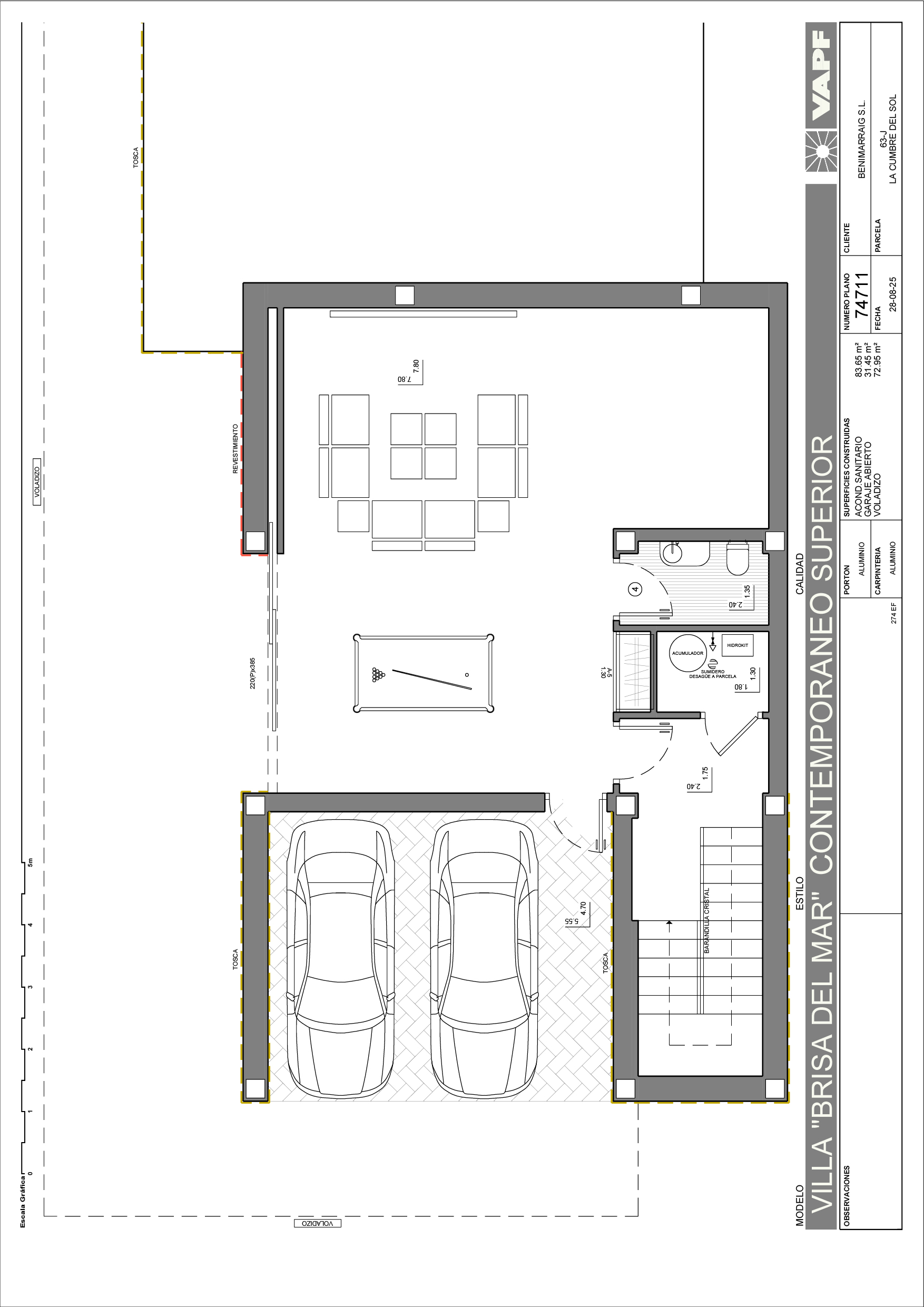 El acceso a Villa Brisa del Mar es cómodo y fluido desde la calle mediante una suave rampa pavimentada que conduce directamente al porche cubierto con capacidad para dos vehículos. Este espacio forma parte de la fachada lateral, y se integra visualmente gracias al revestimiento de piedra y a la continuidad del diseño arquitectónico. Desde el garaje cubierto se puede acceder directamente a la planta sótano, que comunica con la vivienda a través de la escalera interior, ofreciendo privacidad, practicidad y protección frente a las inclemencias del tiempo.
