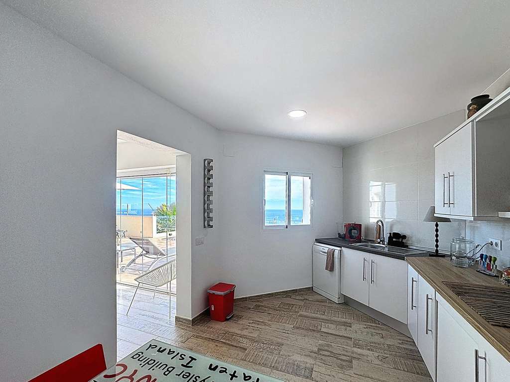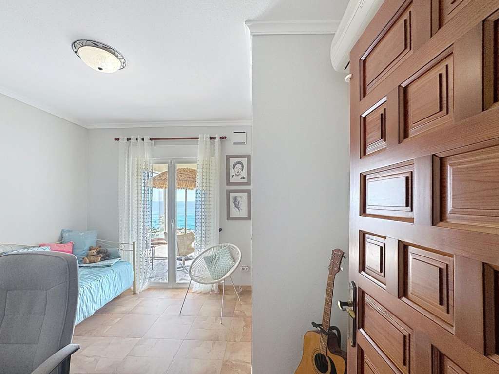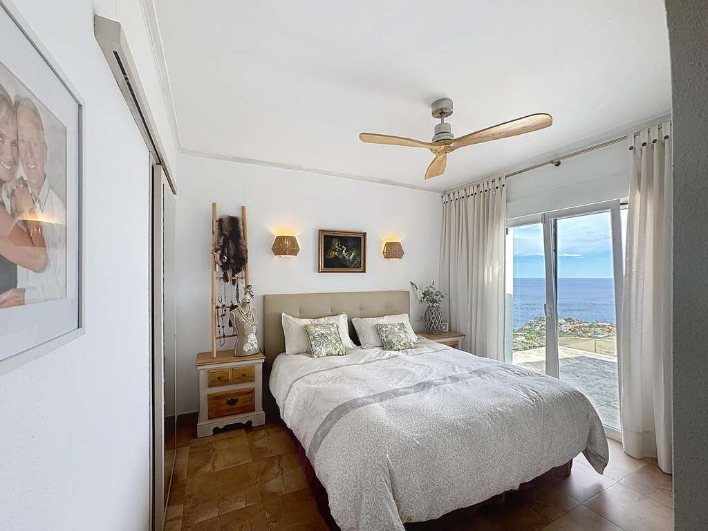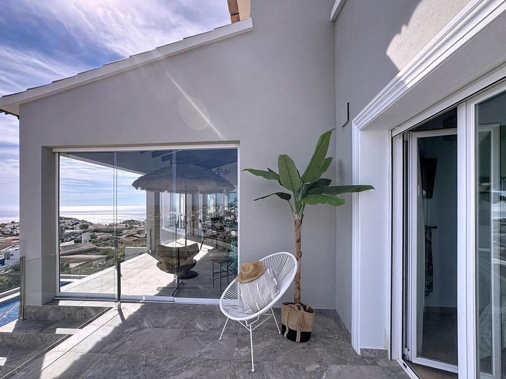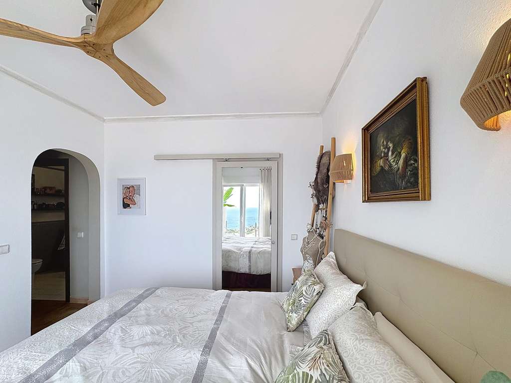 Dos dormitorios dobles con armarios empotrados, uno de ellos con vistas al mar.Cuarto de baño completo y lavadero con ventana.Dormitorio principal con baño en suite, vestidor y acceso directo a la terraza.Cocina americana abierta al comedor, con salida directa a la terraza cubierta con vistas al mar.Salón con chimenea, dividido en dos ambientes: una zona de televisión y otra concebida como mirador panorámico desde el que se contemplan el Cabo de la Nao, Ibiza y la Torre del Portet.Planta bajaDesde una escalera exterior, se accede a la planta baja, donde se encuentra la terraza de la piscina y un acogedor espacio de invitados: