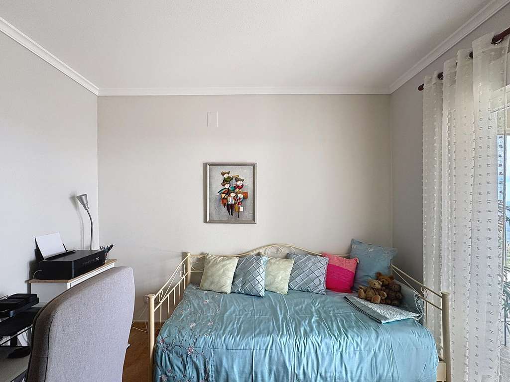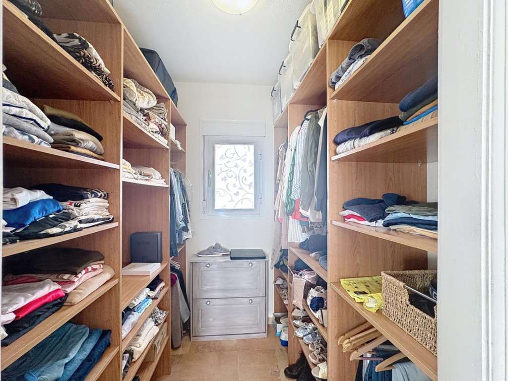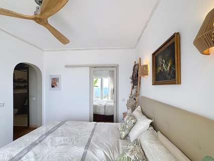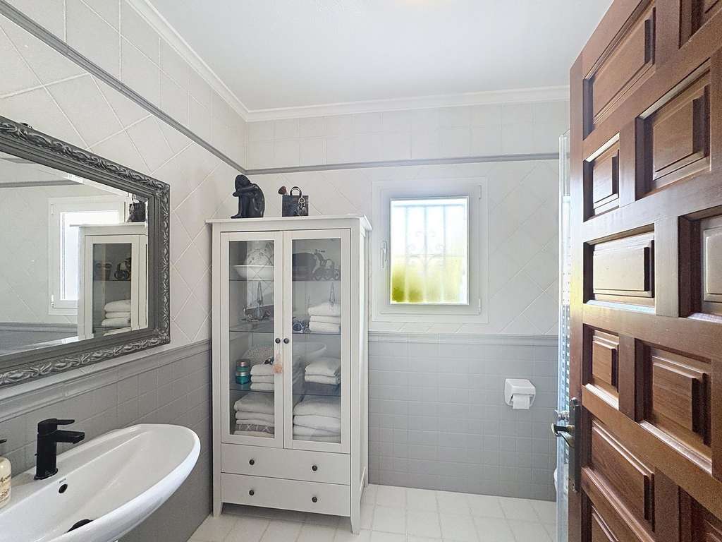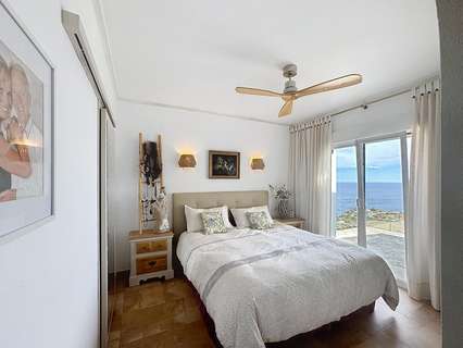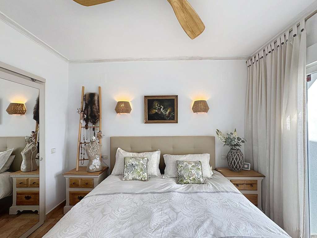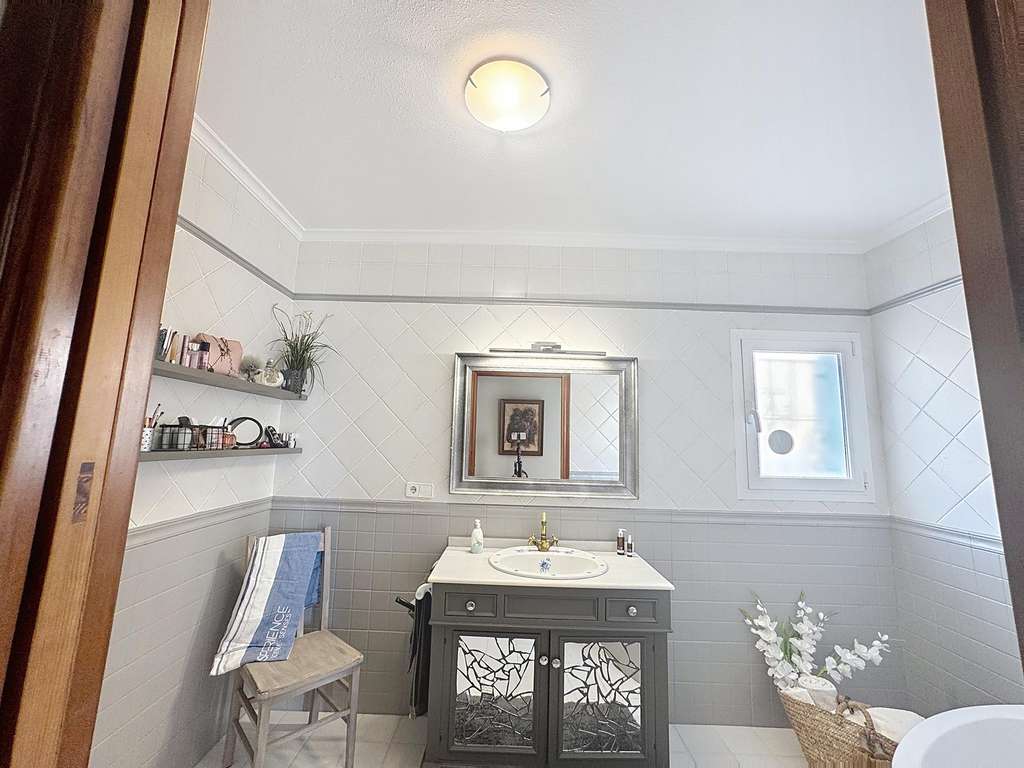 Dos dormitorios dobles con armarios empotrados, uno de ellos con vistas al mar.Cuarto de baño completo y lavadero con ventana.Dormitorio principal con baño en suite, vestidor y acceso directo a la terraza.Cocina americana abierta al comedor, con salida directa a la terraza cubierta con vistas al mar.Salón con chimenea, dividido en dos ambientes: una zona de televisión y otra concebida como mirador panorámico desde el que se contemplan el Cabo de la Nao, Ibiza y la Torre del Portet.Planta bajaDesde una escalera exterior, se accede a la planta baja, donde se encuentra la terraza de la piscina y un acogedor espacio de invitados:
