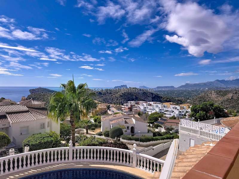 Un dormitorio doble con armarios empotrados, vistas al mar y acceso directo a la terraza.Un cuarto de baño completo.Una cocina independiente con lavadero y despensa, muy luminosa gracias a su ventana exterior.Un amplio salón con chimenea, conectado a la terraza cubierta y a la piscina, ideal para disfrutar del clima mediterráneo.Un comedor con acceso por escalera interior a la planta alta.Planta altaEn este nivel se sitúa un dormitorio principal tipo suite con vestidor, baño con ducha y bañera, y acceso a una terraza con impresionantes vistas al mar y al Peñón de Ifach de Calpe.