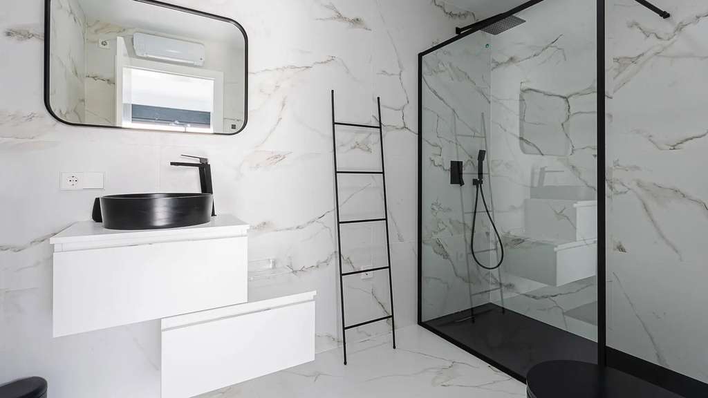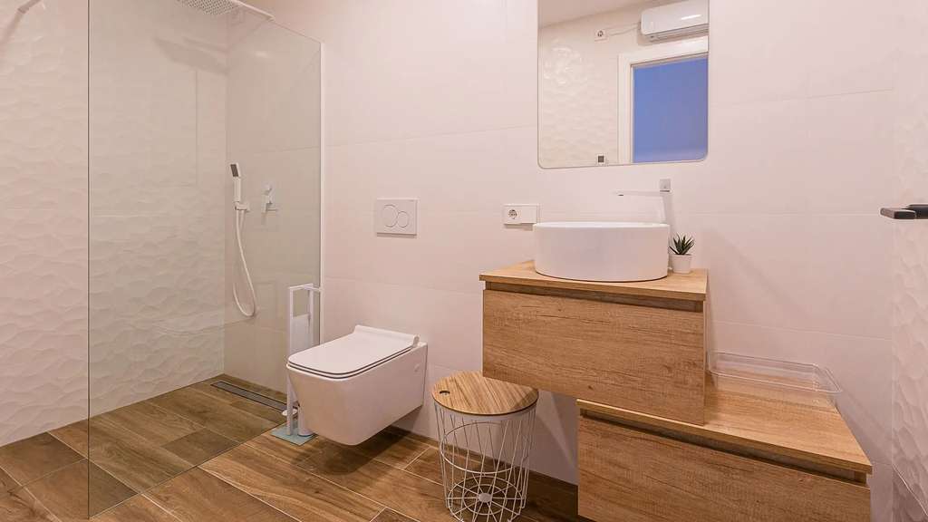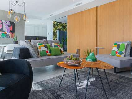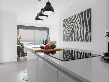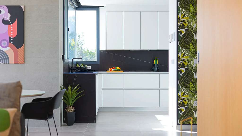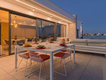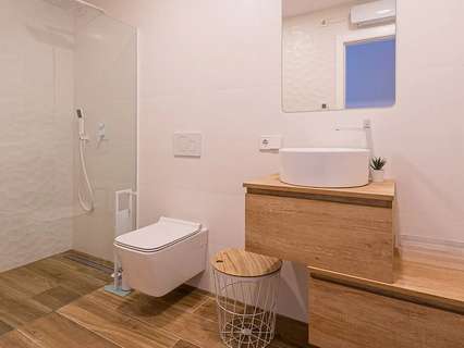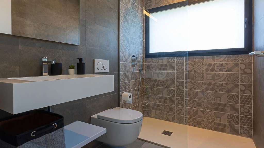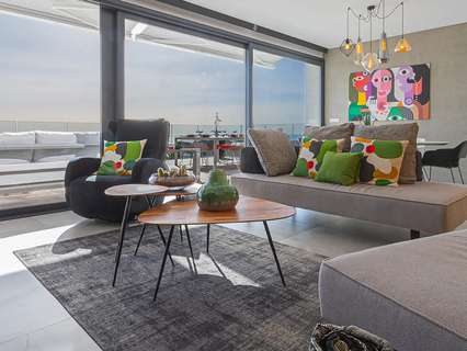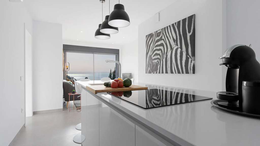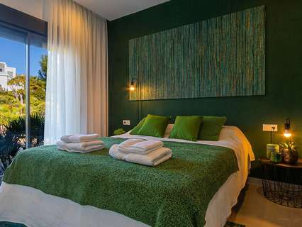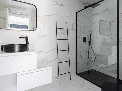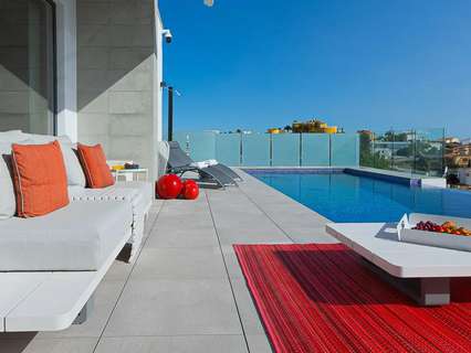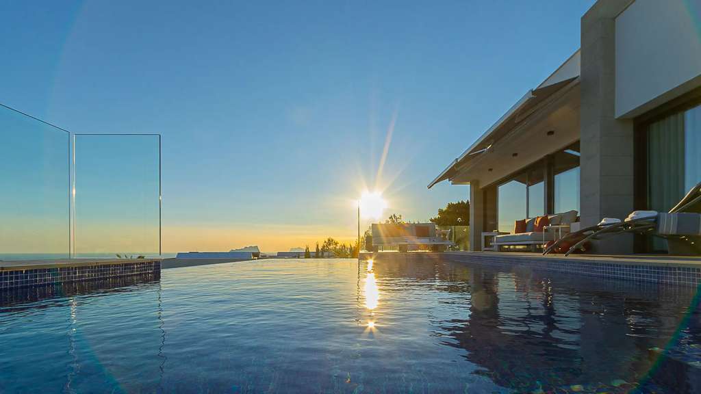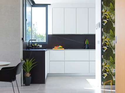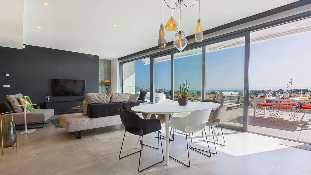 La planta baja, accesible por una escalera exterior, cuenta con un espacio diáfano que incluye un salón y otra cocina americana, además de dos dormitorios, cada uno con su propio baño. La terraza principal es un auténtico oasis, con una piscina rodeada de tumbonas y una zona de relax para desconectar. También hay una terraza inferior con comedor al aire libre bajo un porche con vistas al mar.