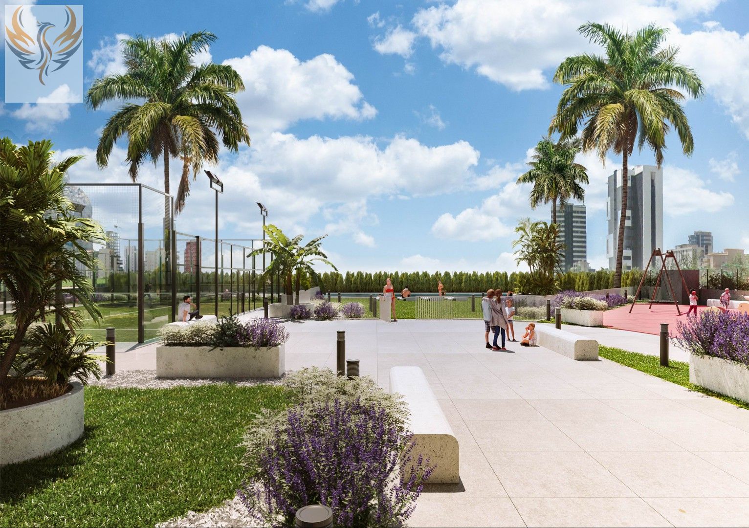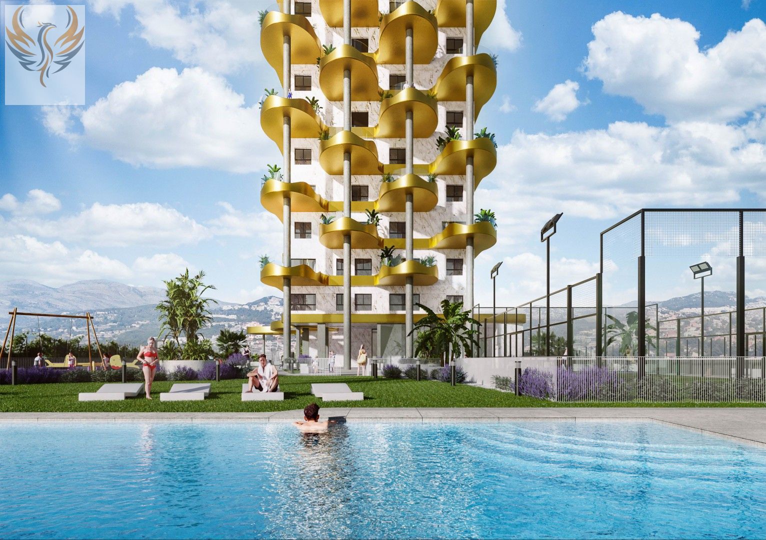 Cada mañana, cada tarde, … vivir integrado en el cielo de Calpe… Le separa de la laguna solamente una parcela de uso escolar. Tiene piscina, pádel, gimnasio, zona de calistenia y juegos infantiles en unas espaciosas zonas comunes. Y su excepcional estética brilla desde un eje, un tronco, con aplacado cerámico en texturas blancas y doradas, marmóreas. Del cual brotan, como hojas, unas terrazas esmaltadas en un impactante dorado luminoso y valiente.