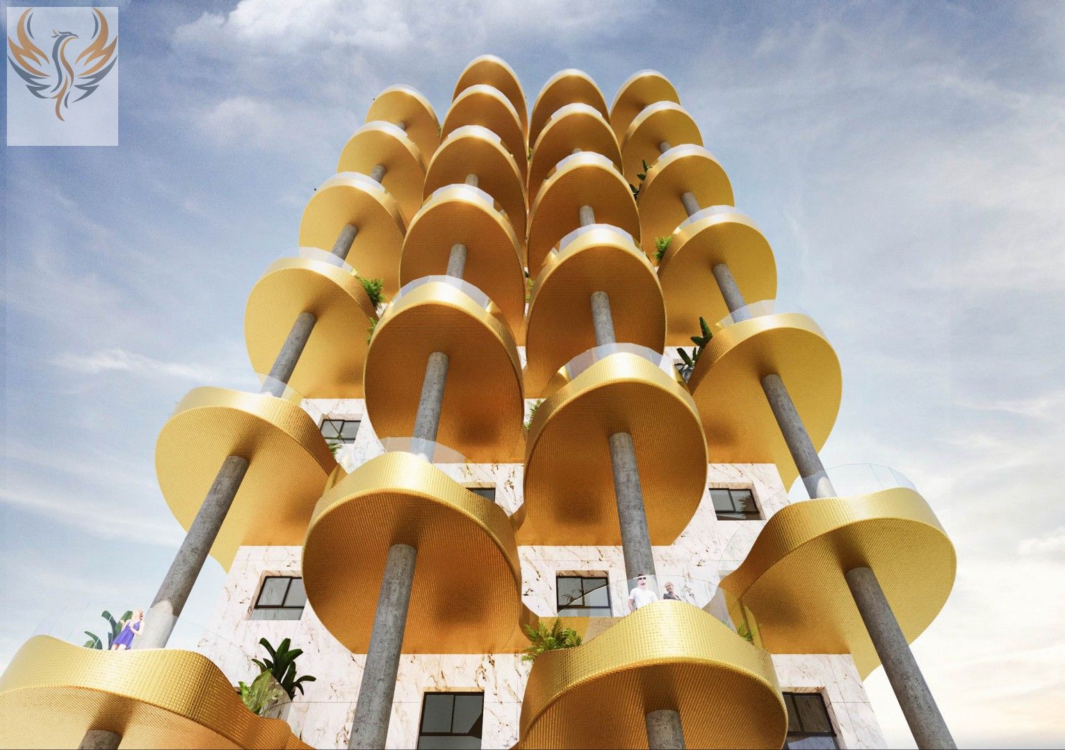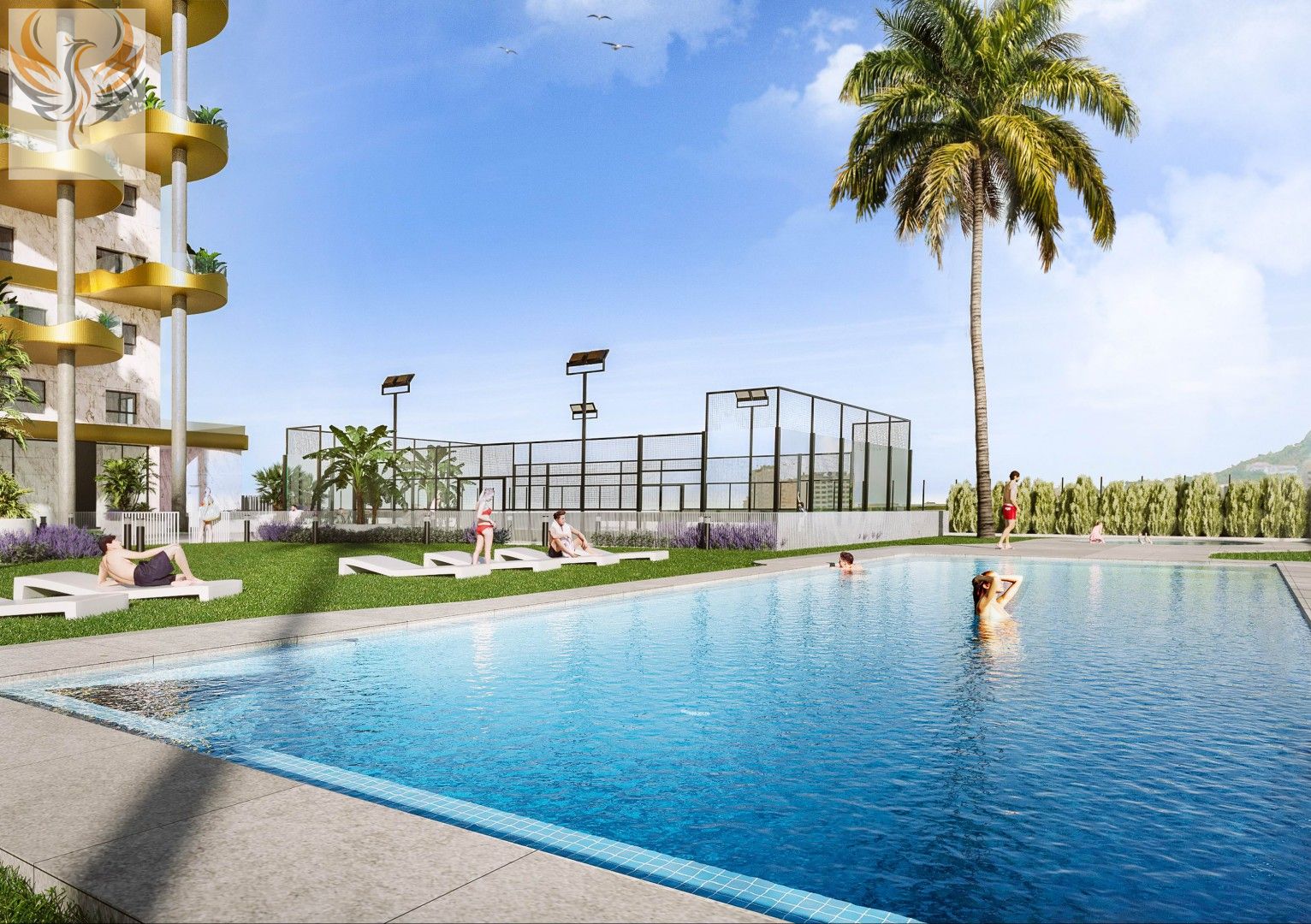 Cada mañana, cada tarde, … vivir integrado en el cielo de Calpe… Le separa de la laguna solamente una parcela de uso escolar. Tiene piscina, pádel, gimnasio, zona de calistenia y juegos infantiles en unas espaciosas zonas comunes. Y su excepcional estética brilla desde un eje, un tronco, con aplacado cerámico en texturas blancas y doradas, marmóreas. Del cual brotan, como hojas, unas terrazas esmaltadas en un impactante dorado luminoso y valiente.