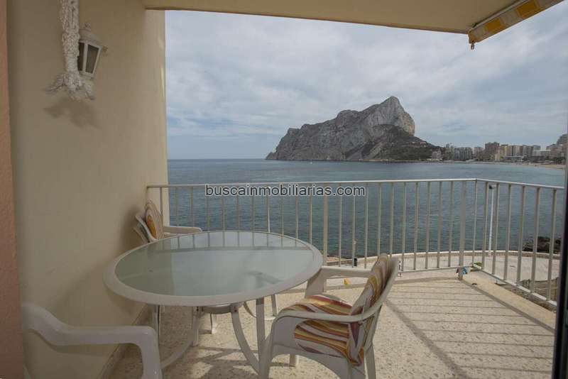 Apartamento en venta en Calpe en primera línea de la playa con vistas espectaculares al mar y al Peñón de Ifach. Hay un espacioso salón-comedor con amplias ventanas con vistas al mar y con acceso a la amplia terraza, cocina independiente equipada, dos dormitorios dobles y un baño. Cuenta con ascensor, parking comunitario y wifi comunitario.