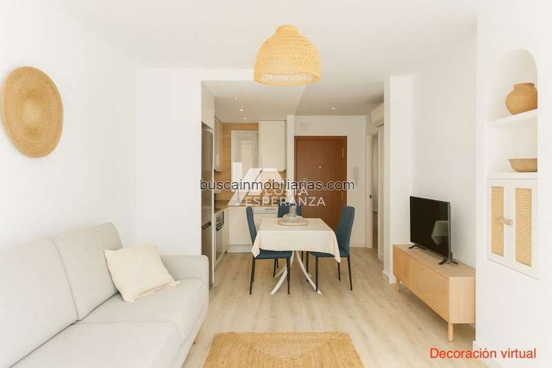 La vivienda cuenta con 1 dormitorio doble con armario empotrado, 1 baño completo con ducha, cocina americana amueblada y equipada, y un luminoso salón que da acceso a una terraza privada con vistas parciales al mar.