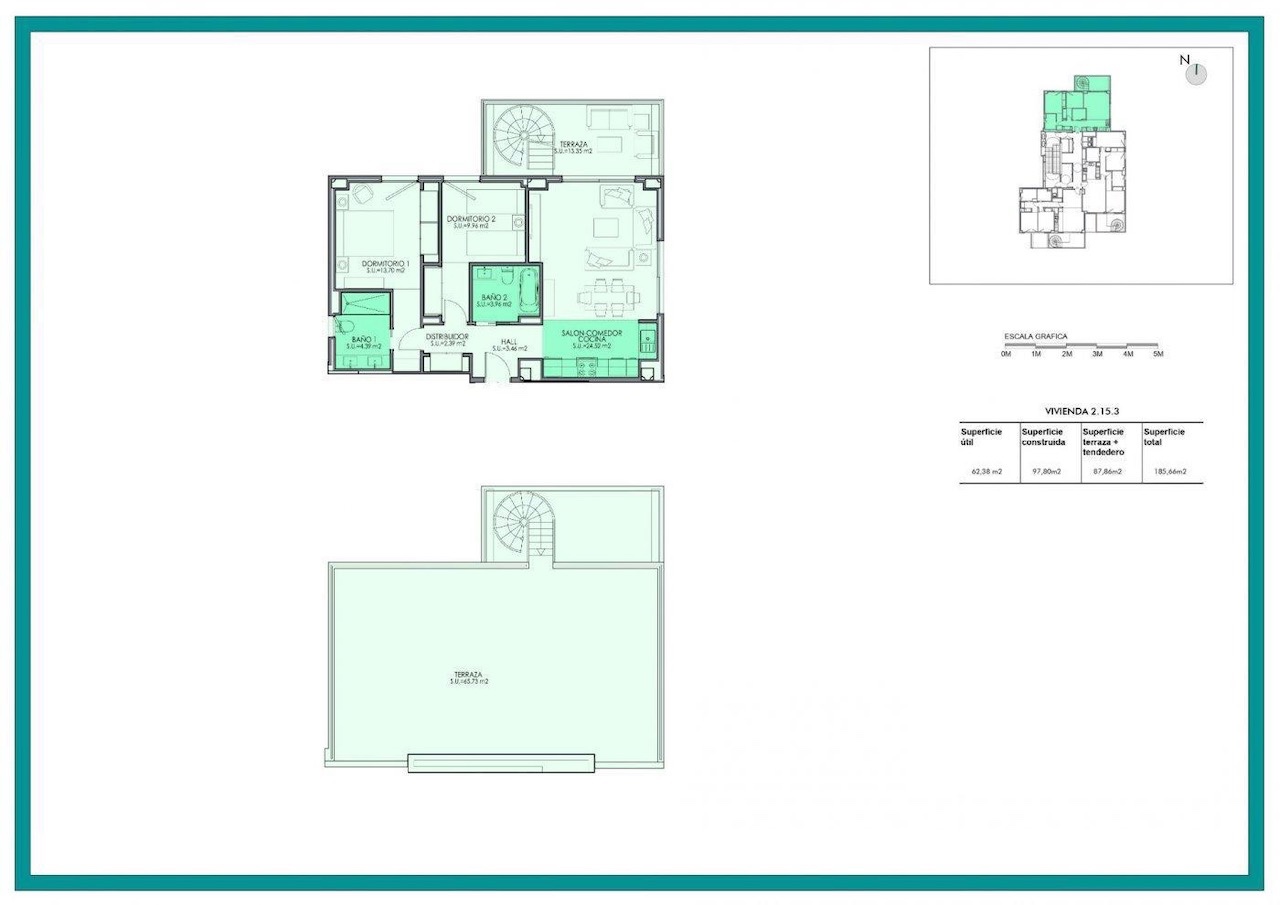 • 2 dormitorios, 2 baños (1 en suite).