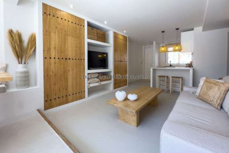 La vivienda cuenta con dos dormitorios acogedores con armarios empotrados y un baño moderno con plato de ducha y lavadora, todo en un entorno interior de estética minimalista con calidos detalles mediterráneos que aportan calidez y personalidad.